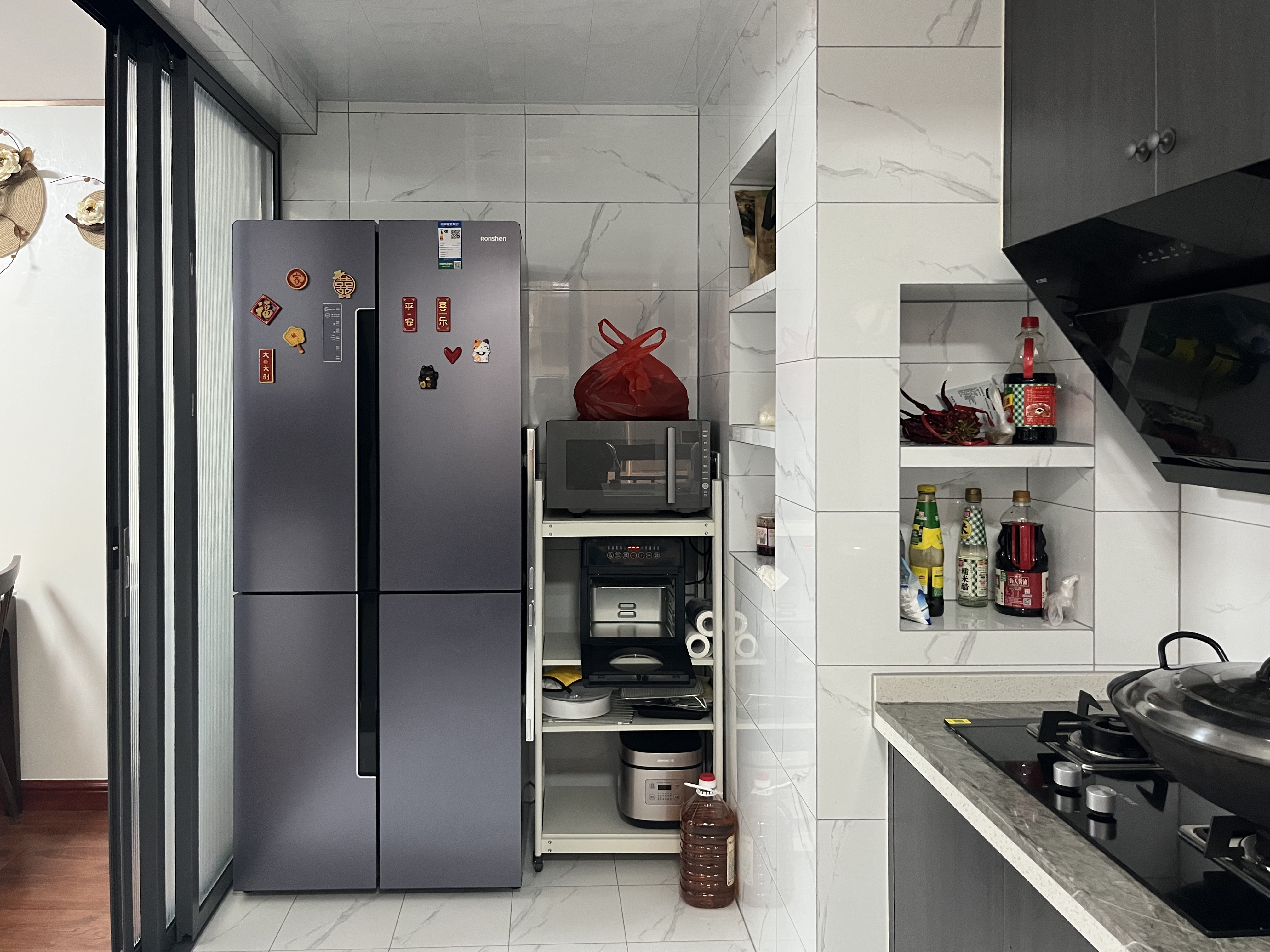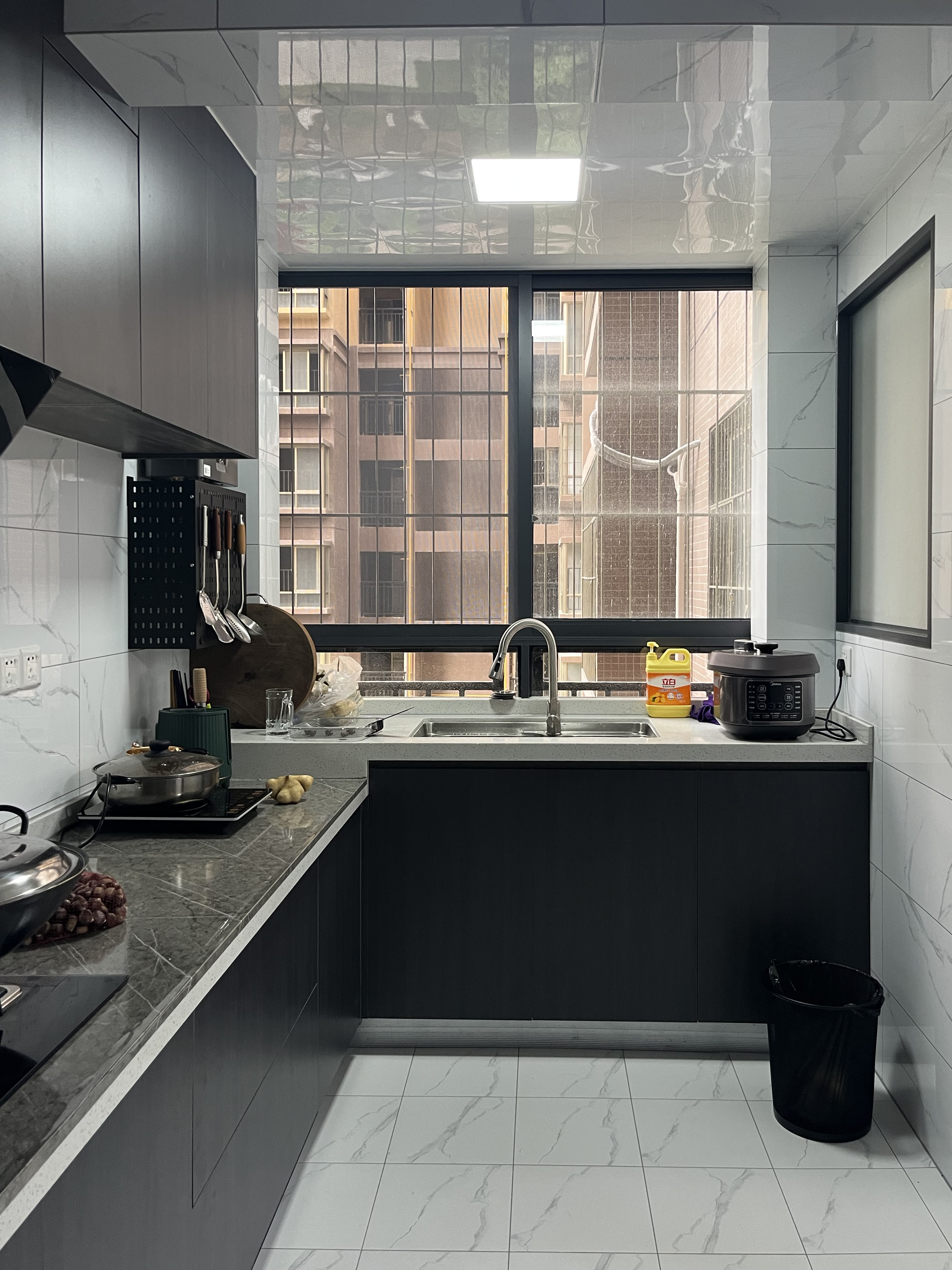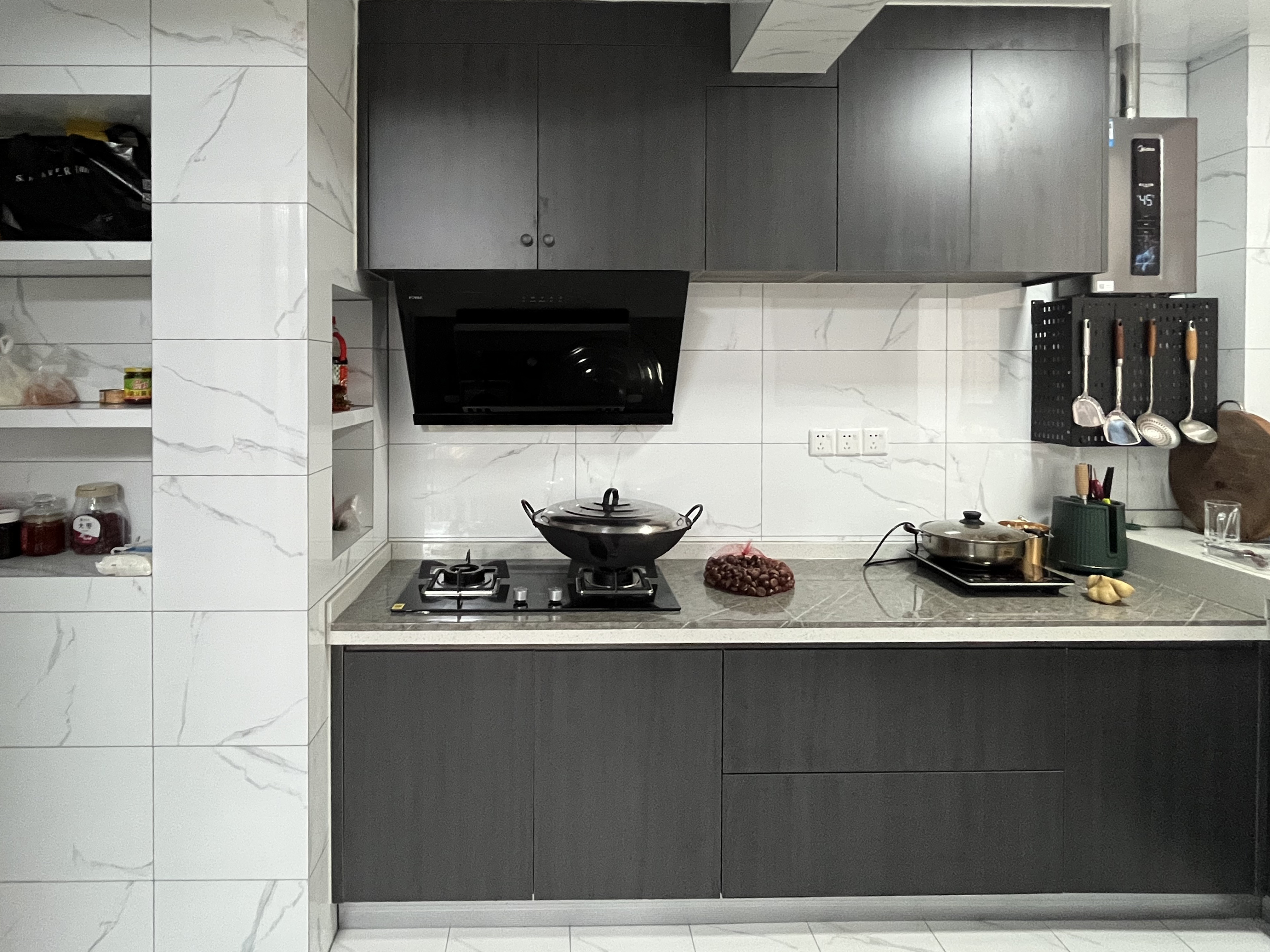 廚房做成了L型的布局,洗菜臺面加高近10公分,方便平時(shí)清洗,墻面會做一些壁龕,方便放置廚房調(diào)料等小的物件,盡可能去保證臺面的整潔,偏灰色調(diào)的櫥柜也讓廚房呈現(xiàn)出大氣感。