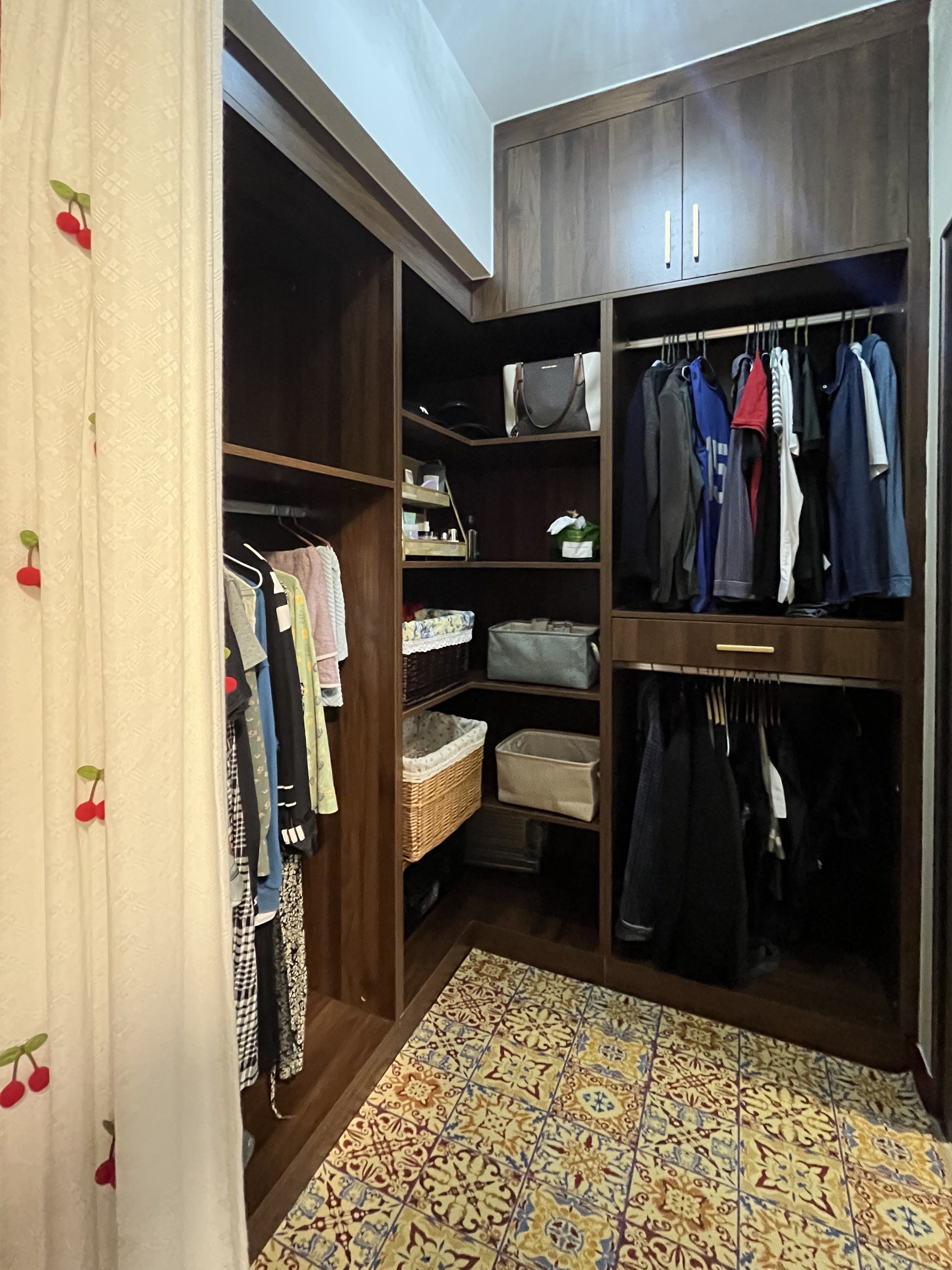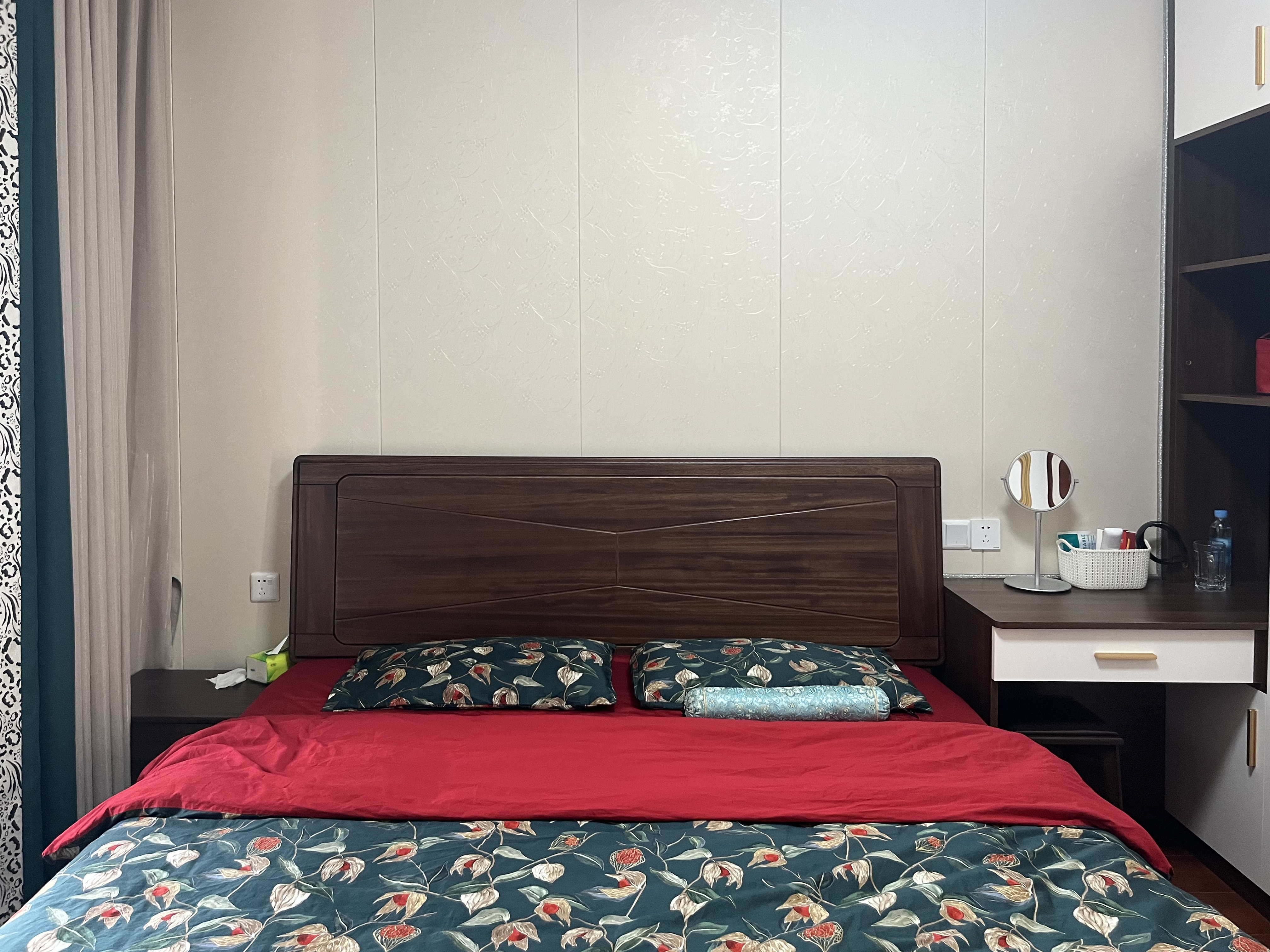 主臥最大限度的利用空間做了一處衣帽間,既實(shí)現(xiàn)了功能的合理分區(qū),又不至于導(dǎo)致空間有急促的狹窄感。床頭柜與衣柜連為一體去設(shè)計(jì),定制化更省事,也能協(xié)調(diào)。