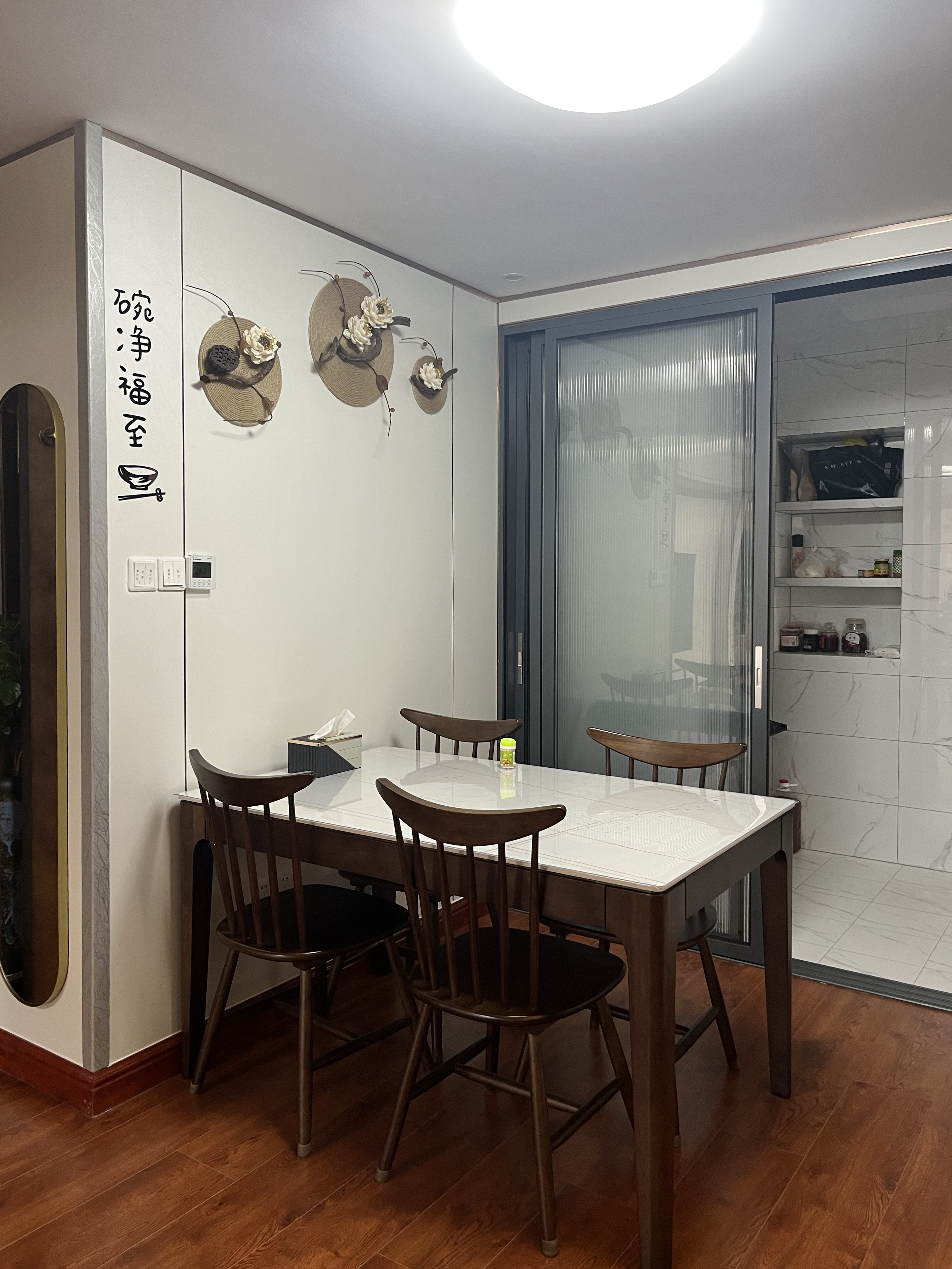 餐廳是一個(gè)很溫馨的角落,沒有冰冷的束縛,在開放的空間里達(dá)到溫馨又舒適的效果,一旁的入門位置用屏風(fēng)去阻擋視線的一目到底,打造入室的懸念感。餐桌靠墻位置的墻面掛上小的裝飾物,細(xì)節(jié)物件打造不經(jīng)意的溫馨精致,另外一邊利用一整面的餐邊柜作為收納“利器”,收納餐廚區(qū)域的雜物,同時(shí)在透明玻璃柜門里嵌入氛圍燈條,無意間形成一整面的裝飾墻。