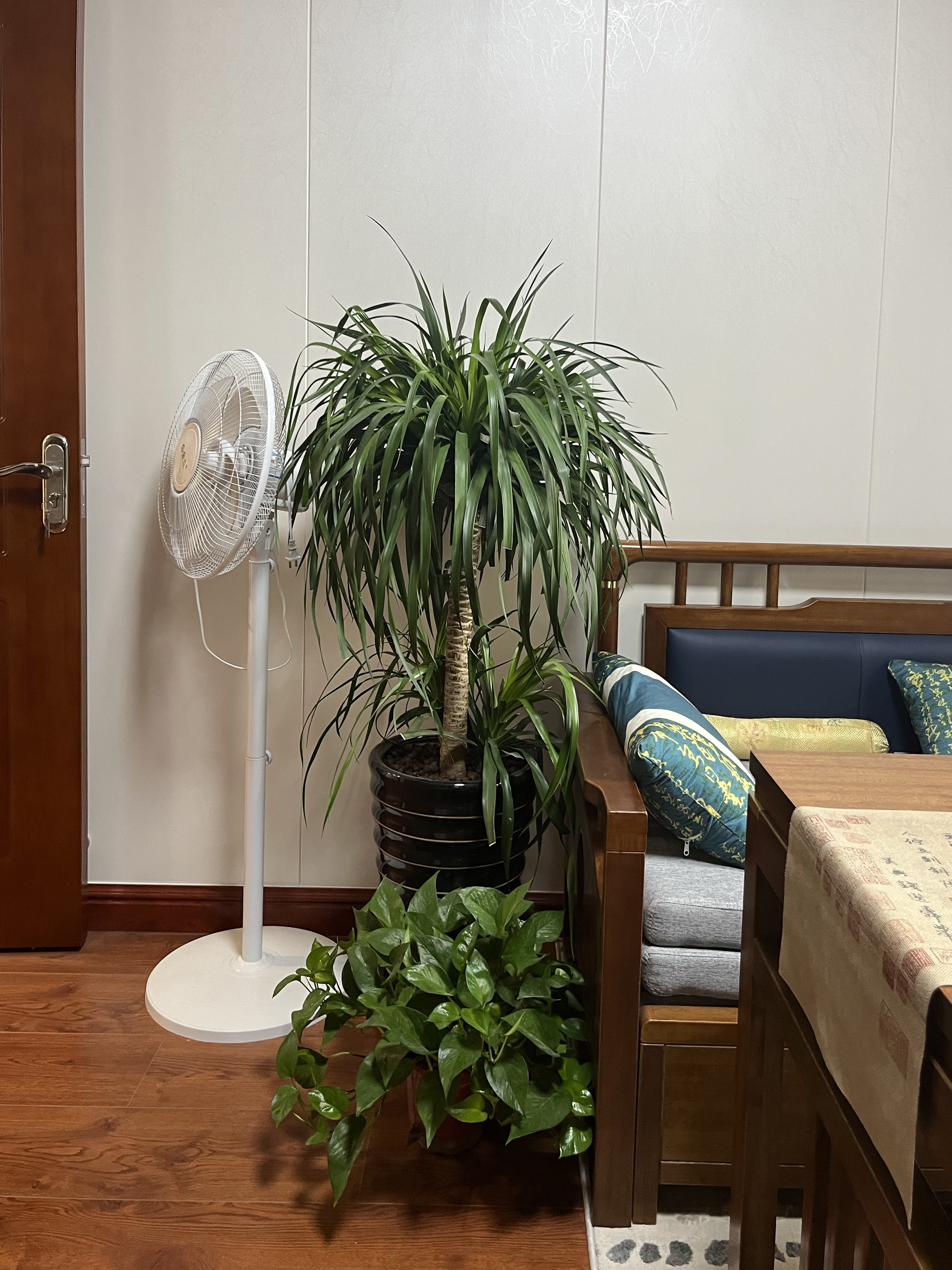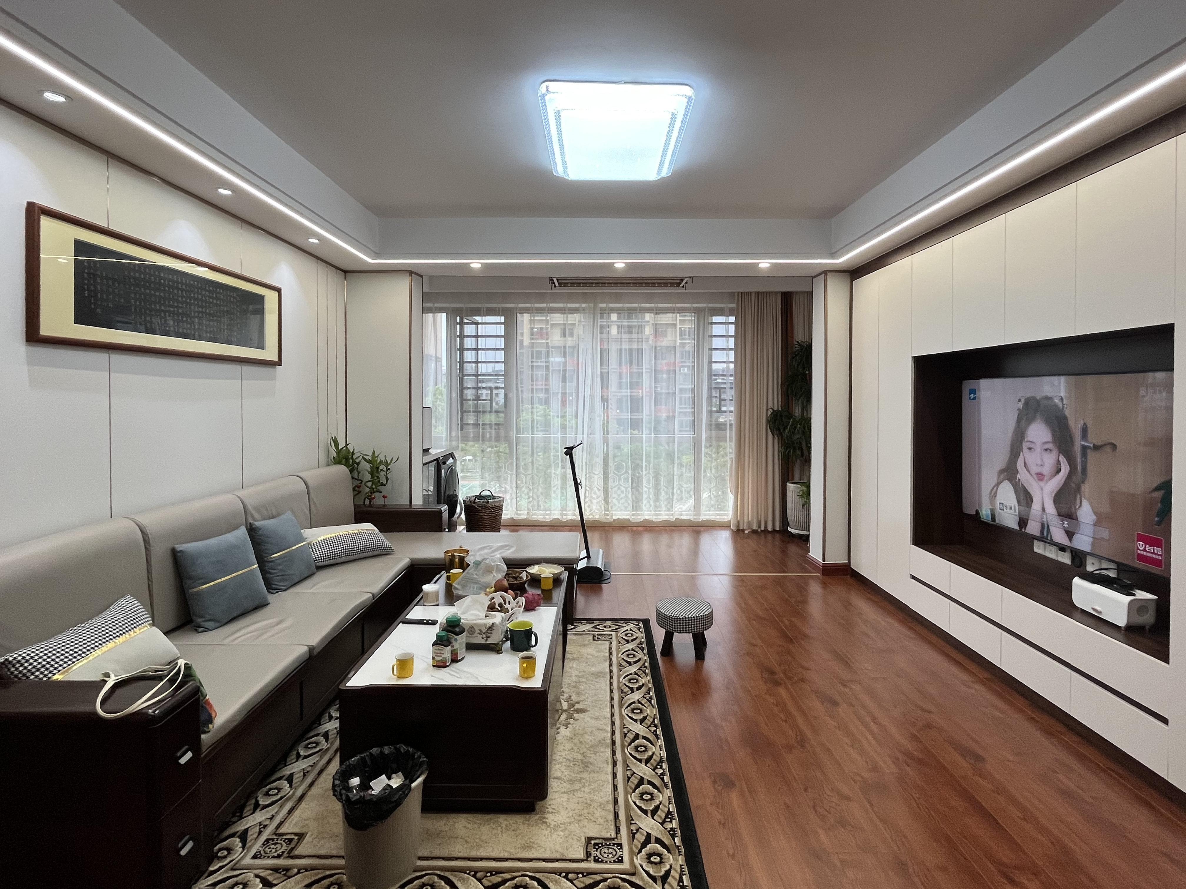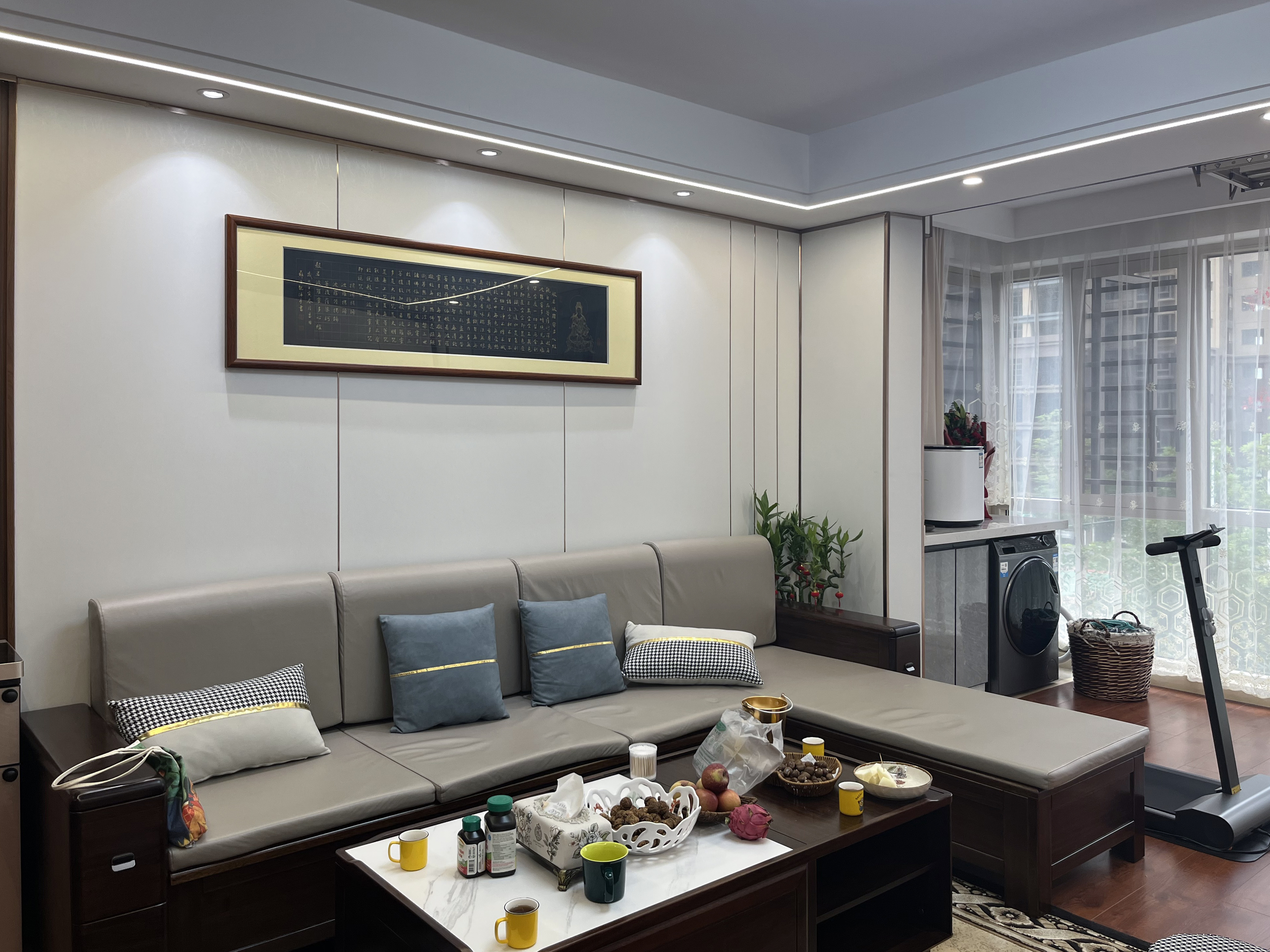 客廳墻面做了護(hù)墻板,以白色調(diào)為主,墻面放上與中式韻味相融合的掛畫,點(diǎn)綴整個(gè)空間的中式古韻,頂上的雙眼皮吊頂環(huán)繞了一圈燈帶,主燈+吸頂燈光的渲染增添了客廳的氛圍感,沙發(fā)L字形的布局更適合于一家人一起在客廳休憩,視線觸及眼前電視,一起看看電視吃吃水果,讓每一時(shí)刻都有舒適的居家體驗(yàn)。
