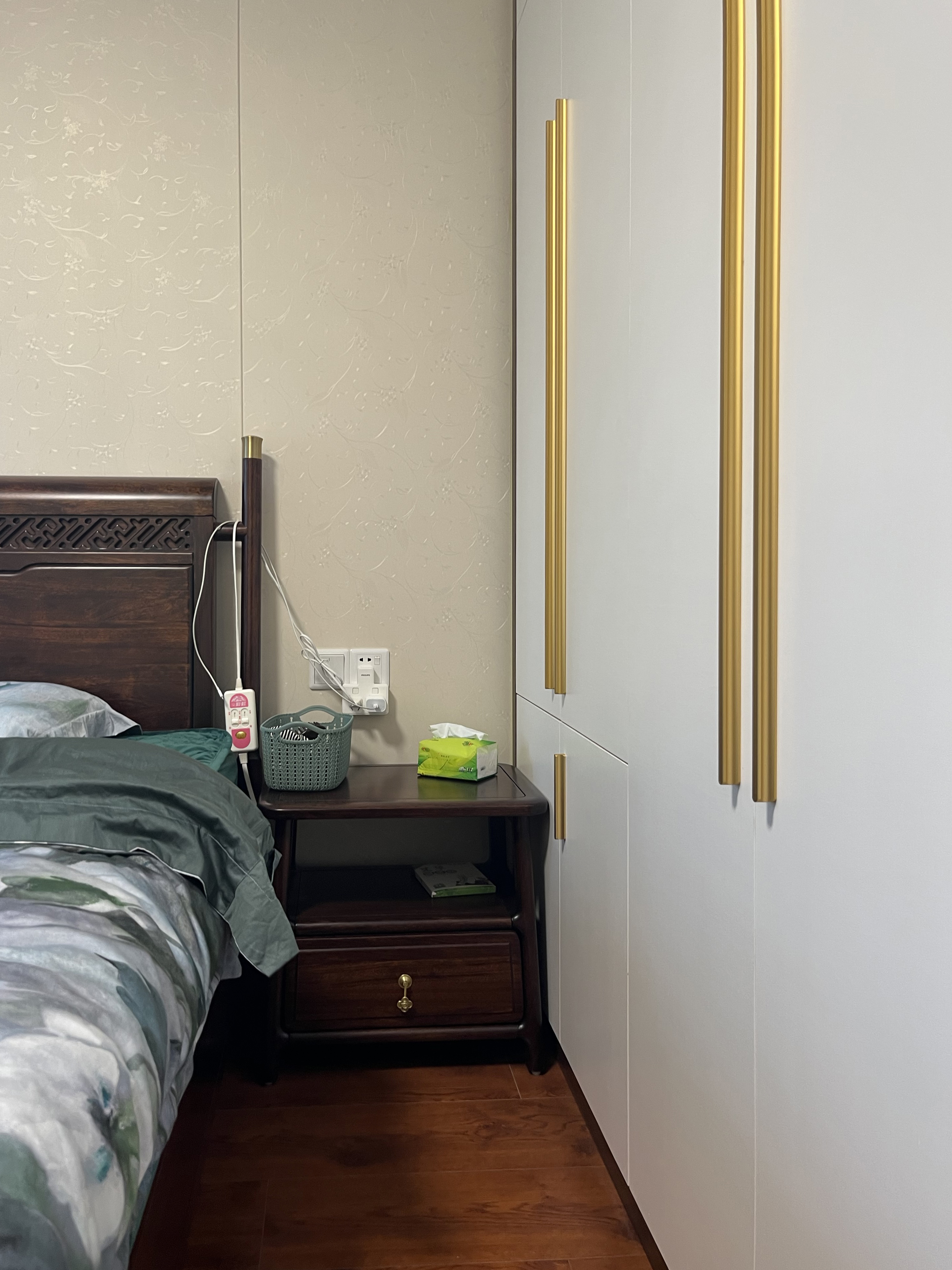次臥則是把一室改成了兩室的完美呈現(xiàn),設(shè)計(jì)的優(yōu)點(diǎn)除了保持新中式的感覺外,收納空間也做得恰到好處,白色的柜門有一種給空間做減法的效果,加上柜門的把手選擇簡單又略帶金屬的精致感,視覺上更多樣也更豐富。