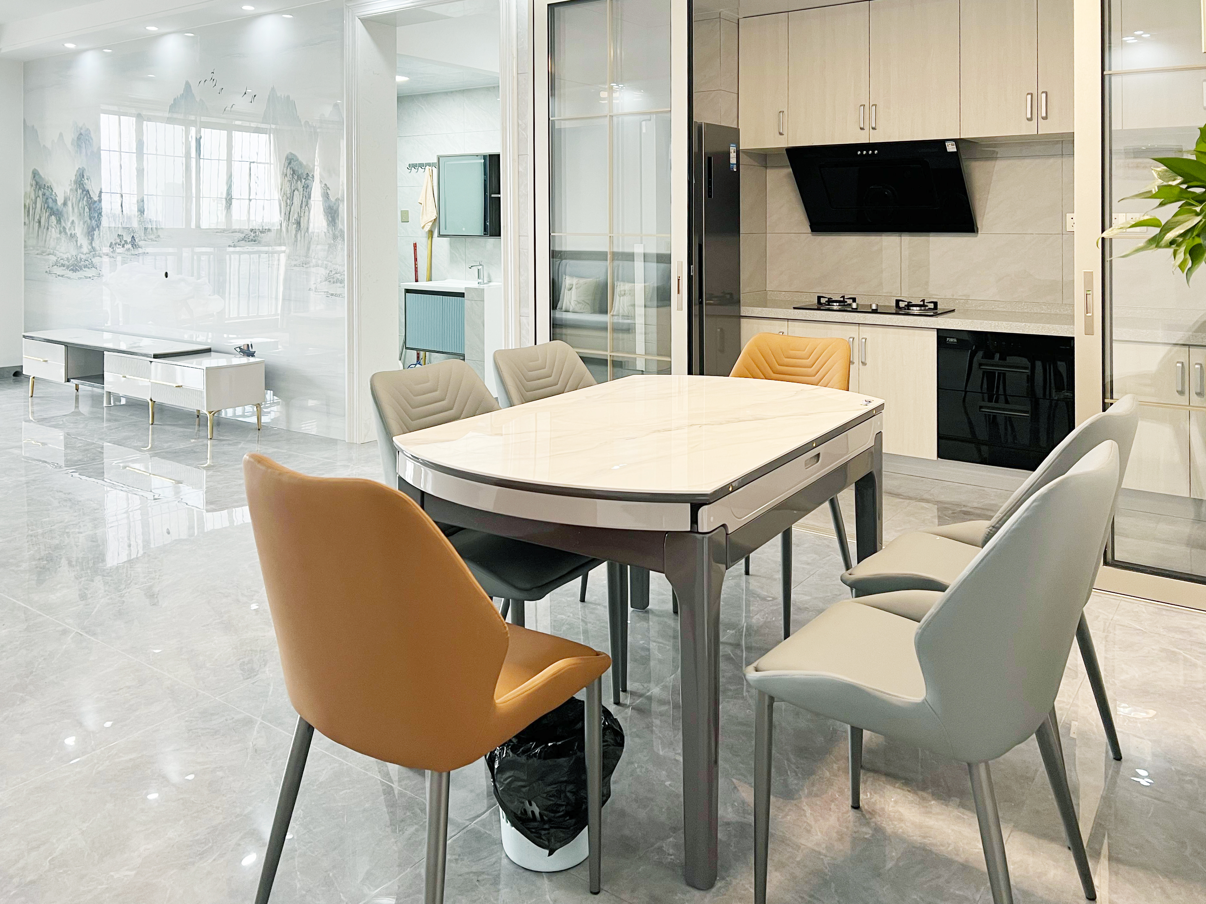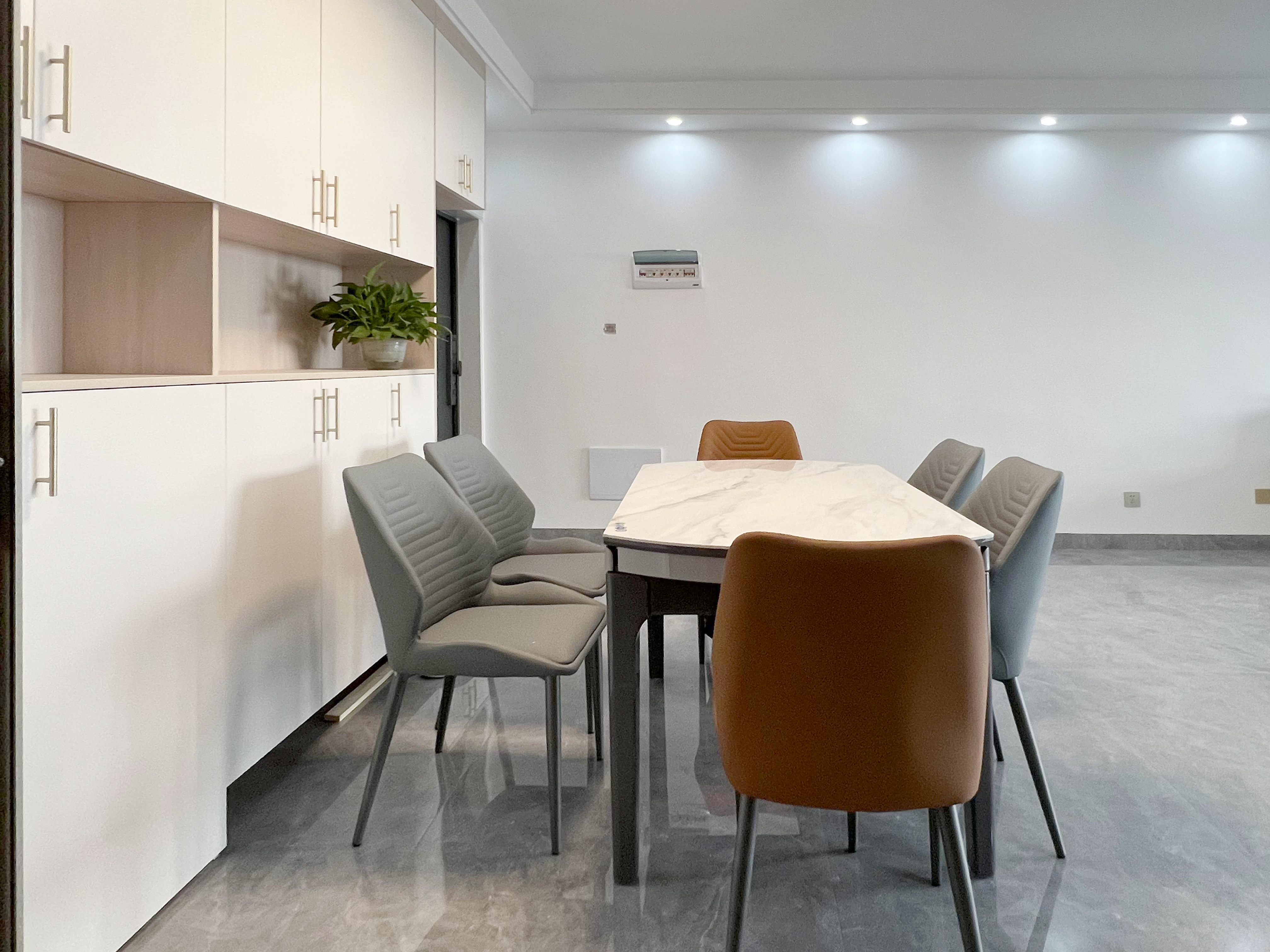 餐廳兩側(cè)都有收納柜,相當(dāng)于在兩邊都做有收納,完美解決了餐廳雜物問(wèn)題,頂部燈光直射餐桌,提前預(yù)設(shè)的燈光能增加整體的就餐氛圍,桌椅的跳色選擇有讓人眼前一亮的驚喜,摒棄單調(diào)。