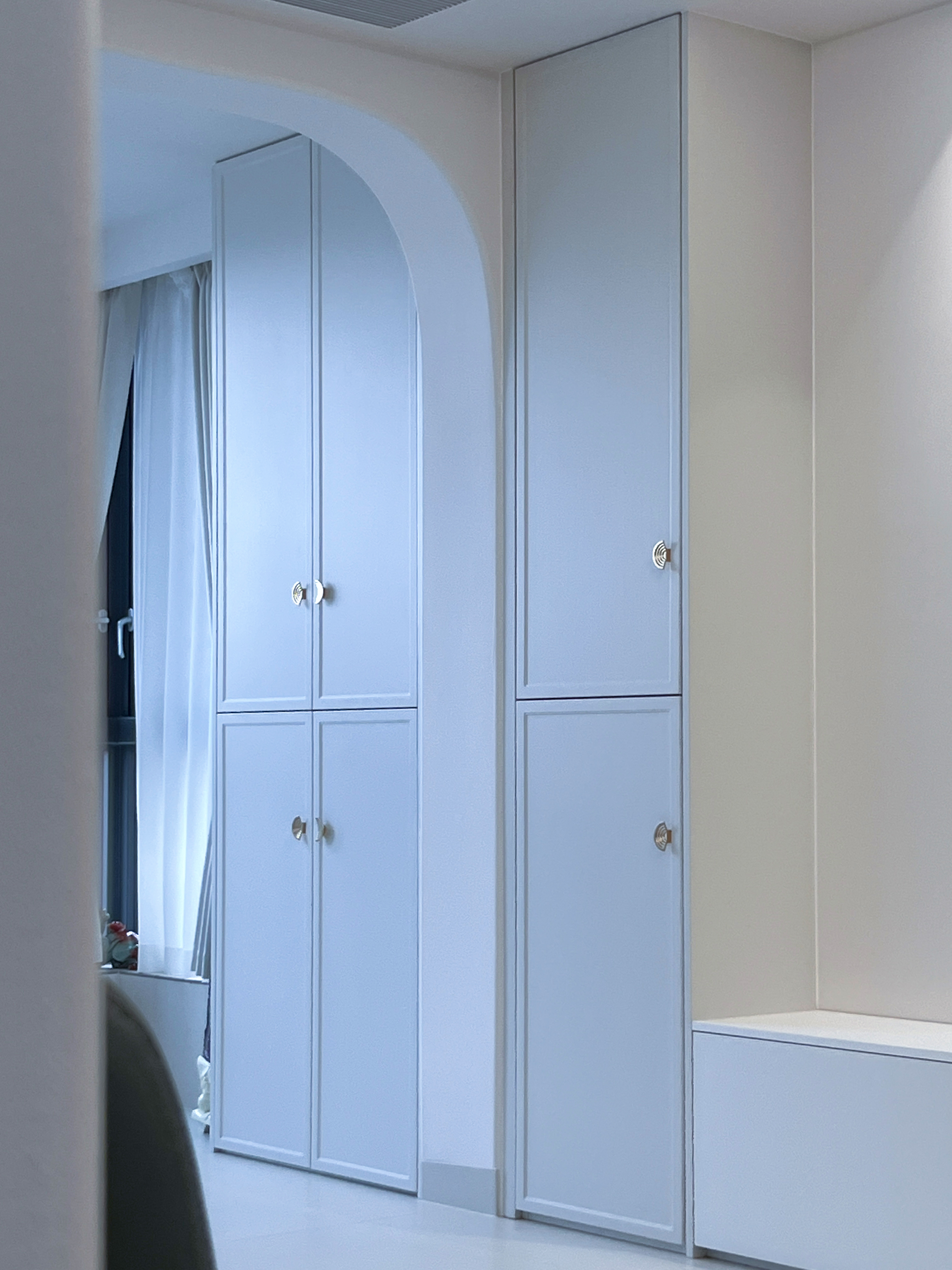 主臥的柜子顏色選擇也依然采用白色,整體的造型都是精心設(shè)計(jì)的成果落地,高質(zhì)感把手像是一面精致柜門的點(diǎn)睛,構(gòu)造出了一排精致簡(jiǎn)約的柜子。