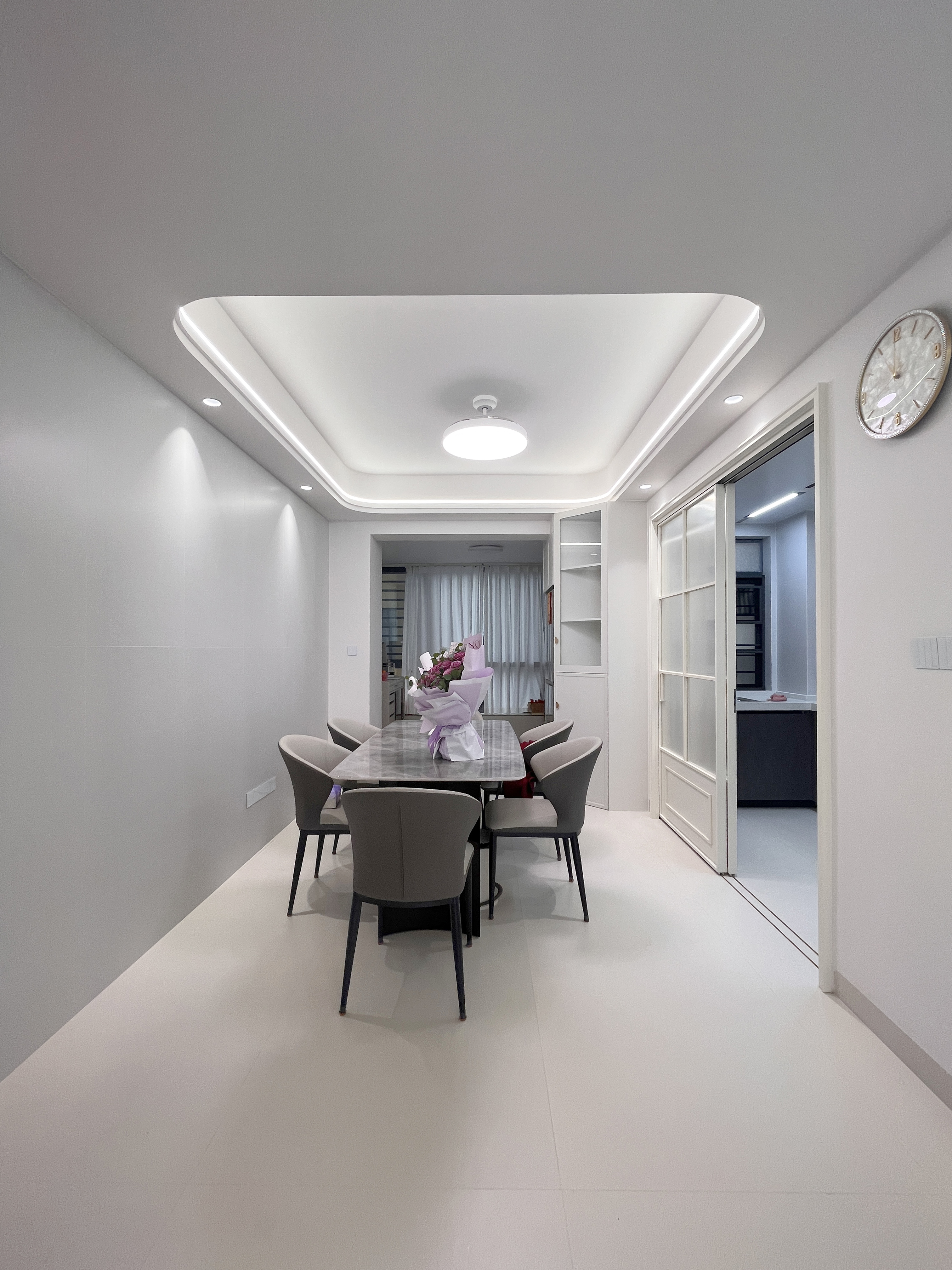 餐廳位置頂上做了專屬空間的吊頂,和客廳形成邊界,在原來的基礎(chǔ)上增加了立體空間感,選擇一個(gè)長(zhǎng)桌做軟裝的布置,很大程度增加了家里人走動(dòng)的公共空間,主燈燈光落下,能很好的營(yíng)造空間的氛圍感。