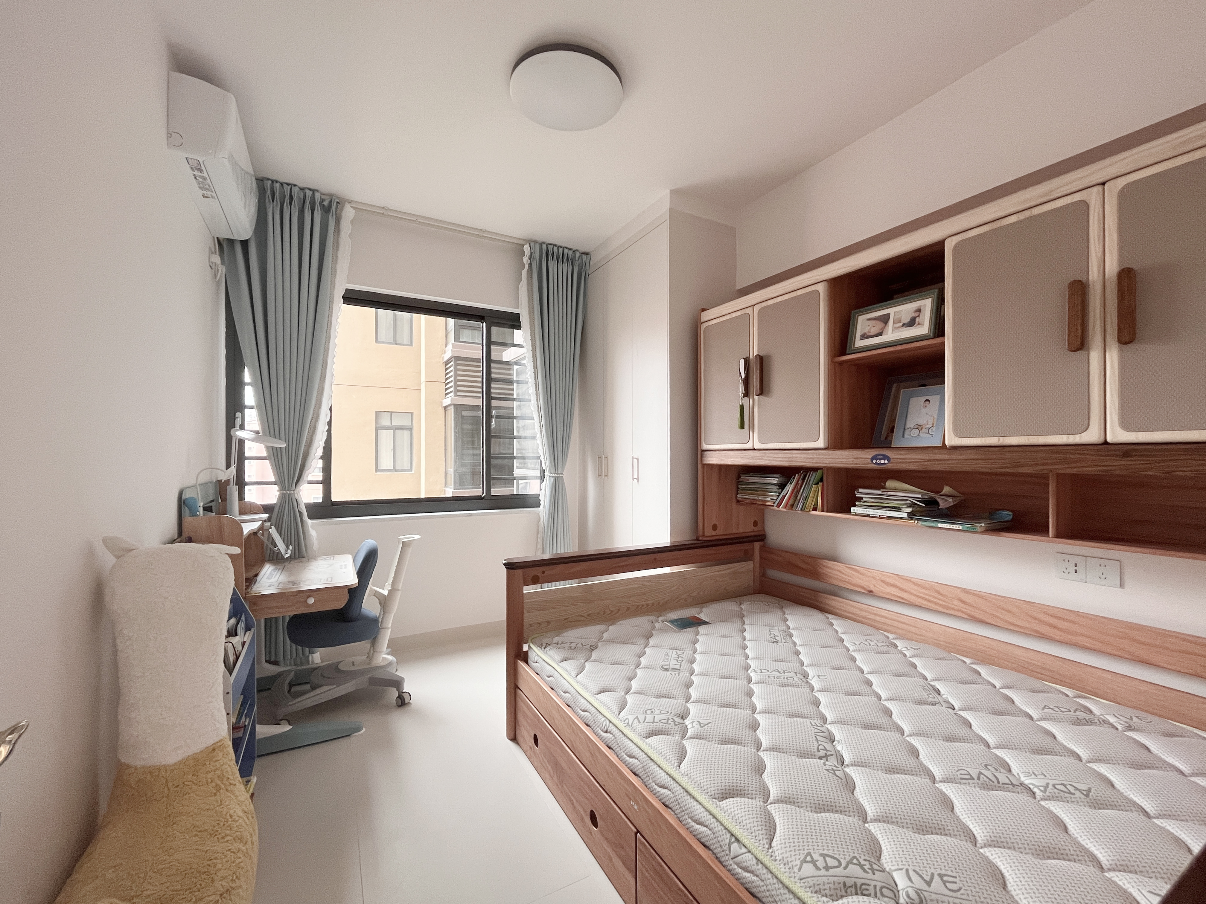 次臥空間更多的考慮了如何把收納空間做的更合理有效,因?yàn)楸旧淼目臻g相對(duì)來說是比較少的,所以在次臥的設(shè)計(jì)上實(shí)現(xiàn)了不同房間的不同風(fēng)格,并保證了走動(dòng)空間的寬度,舒適且自在。