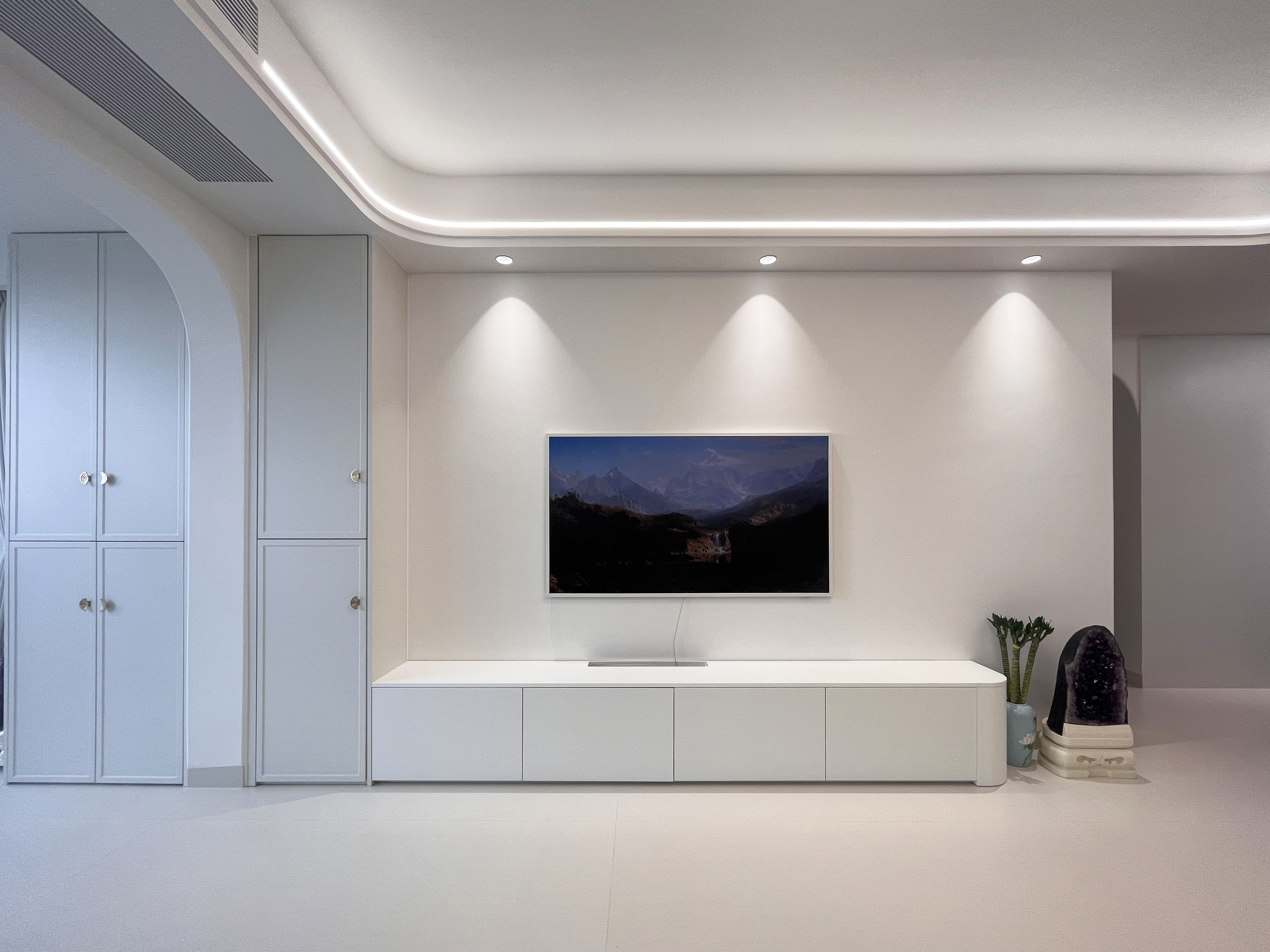 客廳入目就是很純白的色調(diào),有一種高級(jí)的留白感,除去白色,沒有多余的顏色“喧賓奪主”,雙眼皮吊頂在造型上加了燈帶,溫馨的燈效能夠增添視覺上的溫馨以及高級(jí)感,電視背景墻利用簡(jiǎn)單的落地柜實(shí)現(xiàn)了一部分的收納,實(shí)用且美觀??蛷d的軟裝主要以簡(jiǎn)約為主,目前只添置了一個(gè)沙發(fā),綠色的顏色選擇給空間很清新的感覺,有很大的視覺跳躍感。