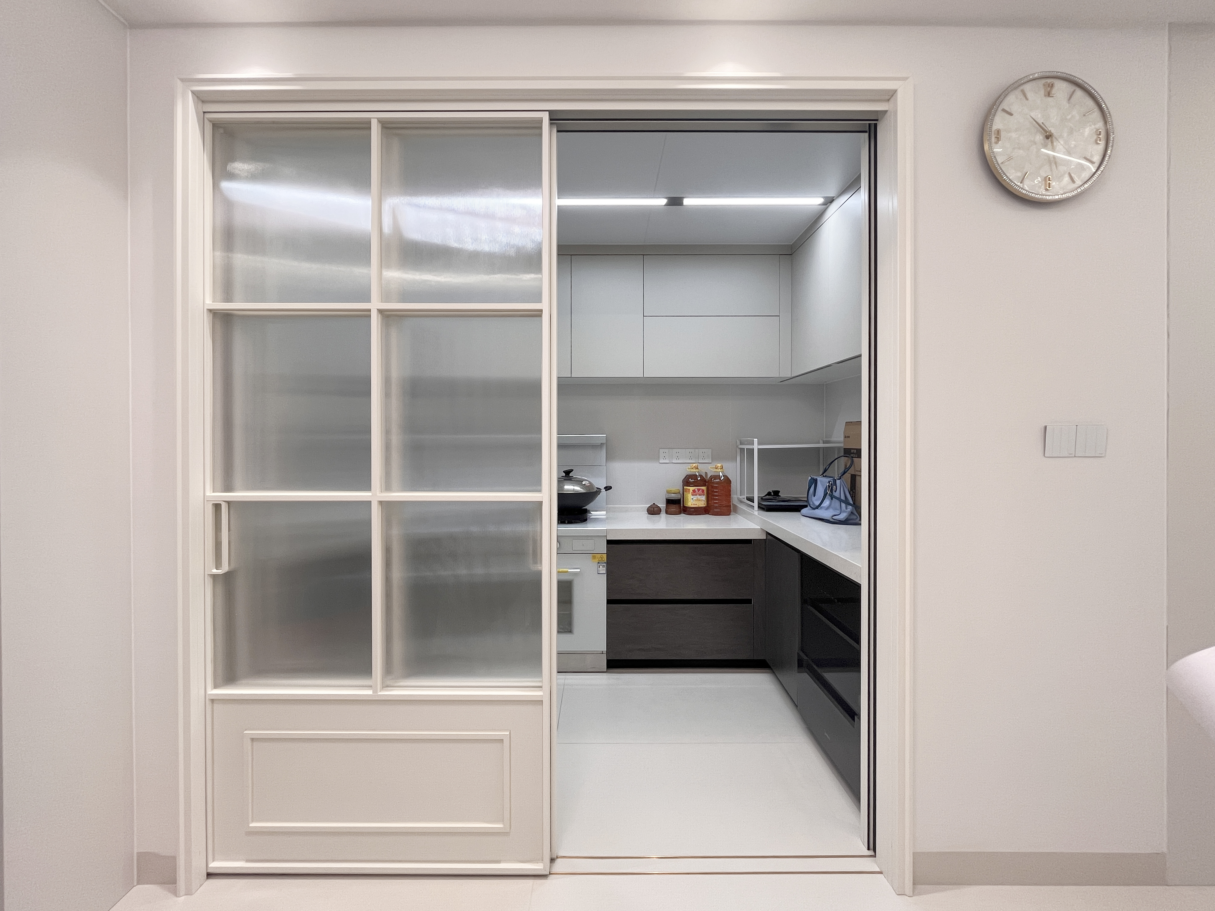 廚房推拉門的選擇跟整體的色調(diào)很呼應(yīng),一扇門隔開一個(gè)油煙空間,保證油煙不外竄。廚房?jī)?nèi)部色調(diào)上的搭配除了盡可能與整體風(fēng)格搭配以外,還選擇了相對(duì)來水比較耐臟的櫥柜顏色,下面部分如果有了水漬也比較容易清理,而上部分的櫥柜則是能最大限度地與公共空間融合,增加視覺上的空間感。