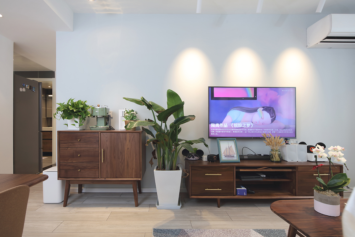電視背景墻使用的是清新的淡藍(lán)色,簡單自然,在射燈的映襯下溫馨舒適。