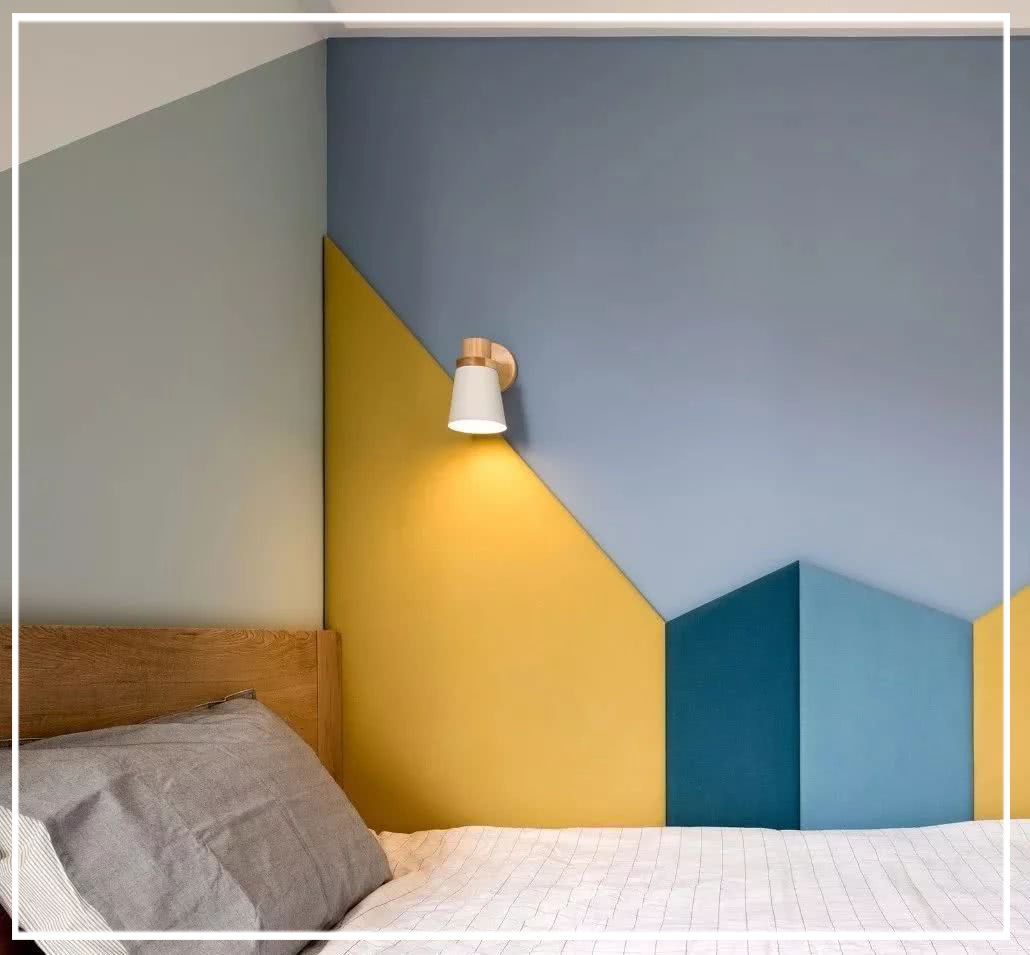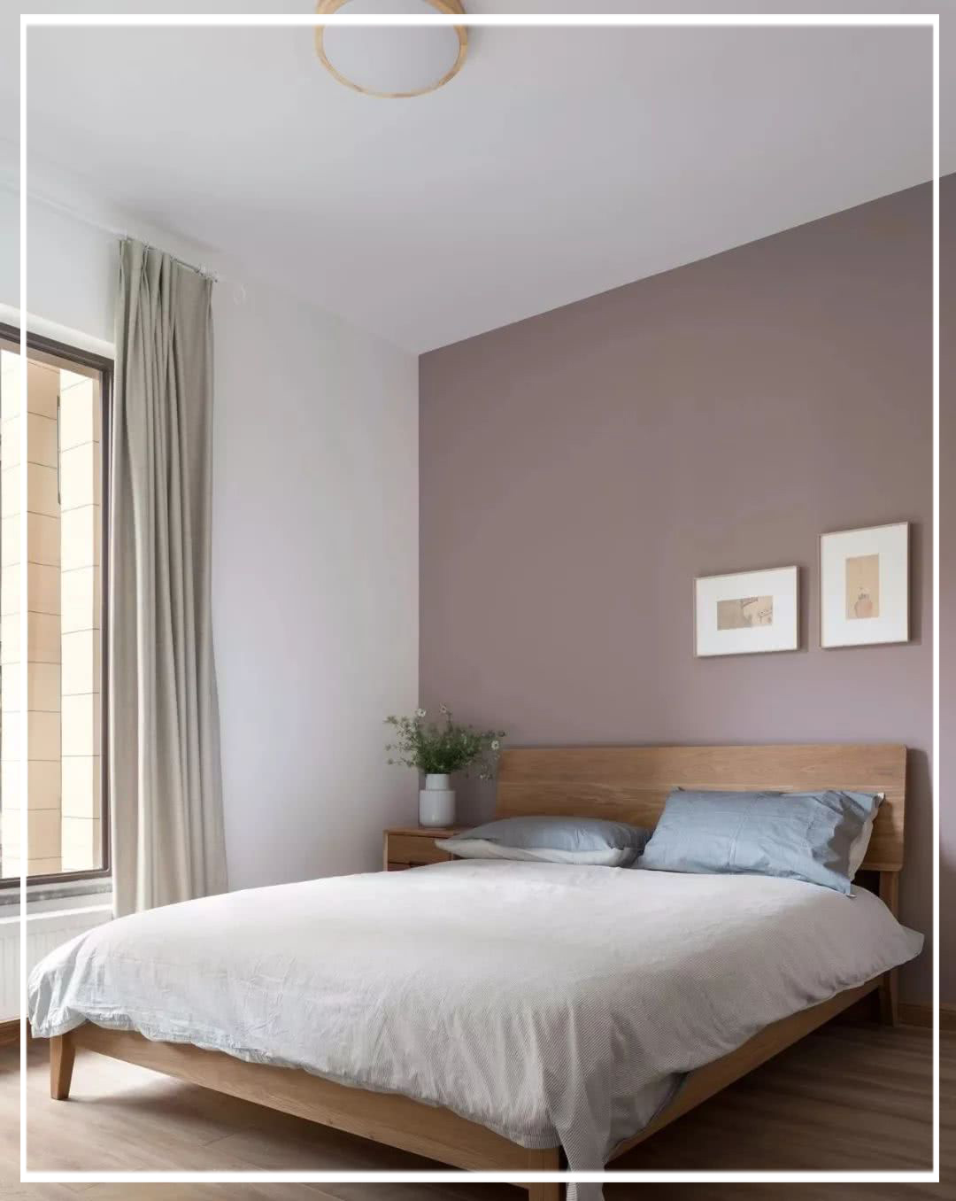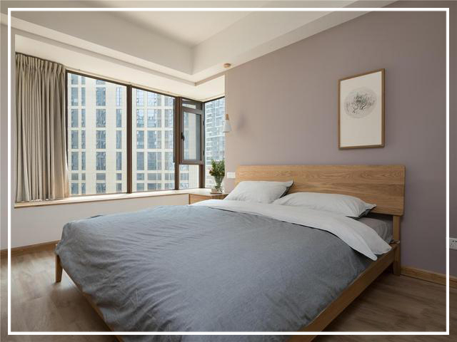 原木色一體床搭配一面莫蘭迪色柔美的背景墻