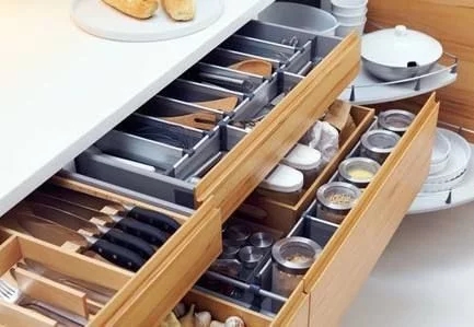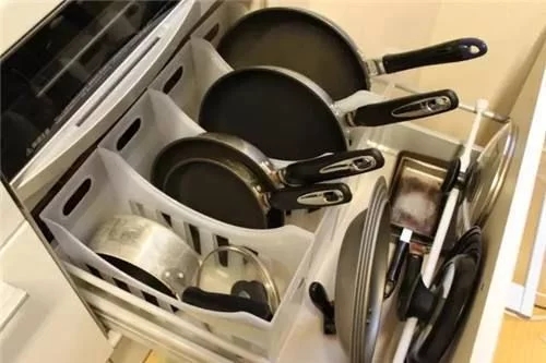 這里建議采用抽屜式的收納地柜,設(shè)計(jì)時(shí)考慮放置物品的的大小設(shè)置抽屜的高度和深度,一般從上至下進(jìn)行遞增,將物品豎起來,再用收納架隔離不同的鍋碗,拉開抽屜,所有的物品一目了然。