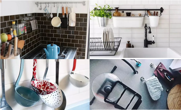 很多時(shí)候我們覺得廚房擁擠是因?yàn)?,供我們施展廚藝的臺面被鍋蓋、鍋鏟、湯勺、菜刀、漏勺、小奶鍋等廚具占據(jù)了,這些雜物剛好是我們使用頻率較高的物品,如果收起來用的時(shí)候拿取就不方便,最好的辦法是讓它們上墻。