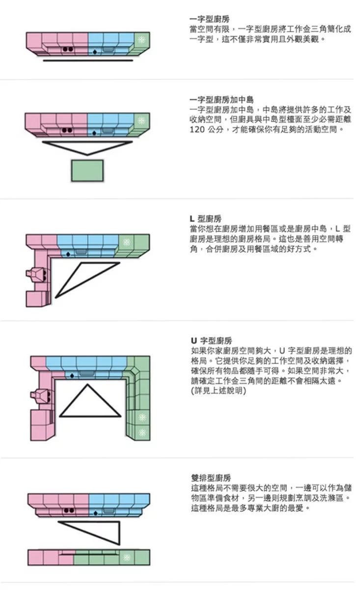 如果家里的廚房沒有足夠的空間呈現(xiàn)這個(gè)工作金三角,可以在裝修時(shí)通過合理的規(guī)劃讓這三點(diǎn)達(dá)到金三角的效果,讓廚房的工作更流暢更有效率。