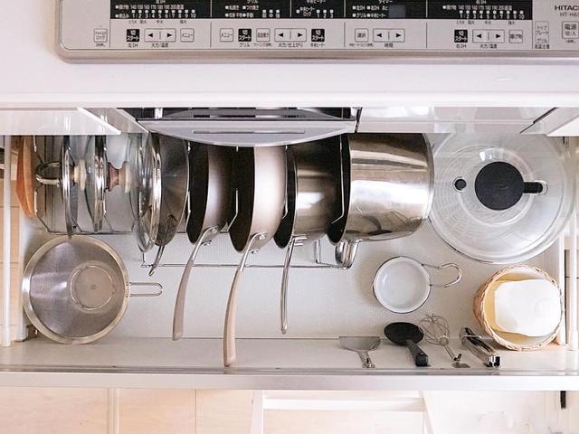 水槽下面也是很好房儲存空間,可以將洗菜盆、洗潔劑、案板等和水、清潔、備菜相關(guān)的物品或者常用的大鍋藏于此,洗碗備菜需要什么一彎腰就可以拿到。