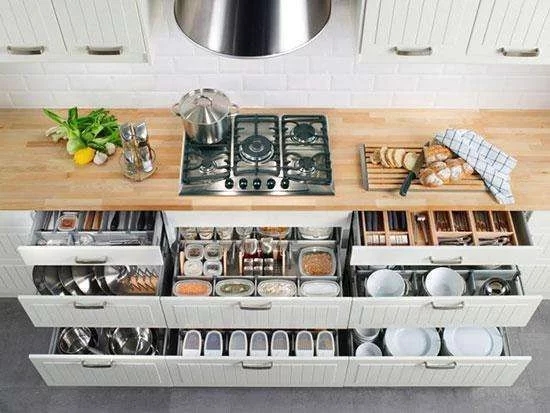 廚房的展示和上墻空間有限,不可能收納完所有東西,大堆的雜物亟待解決,這時(shí)候我們就要用到“藏”的收納方法,讓物品藏于內(nèi)里卻不影響使用,做到臺面空無一物,我們才能在廚房大展身手。