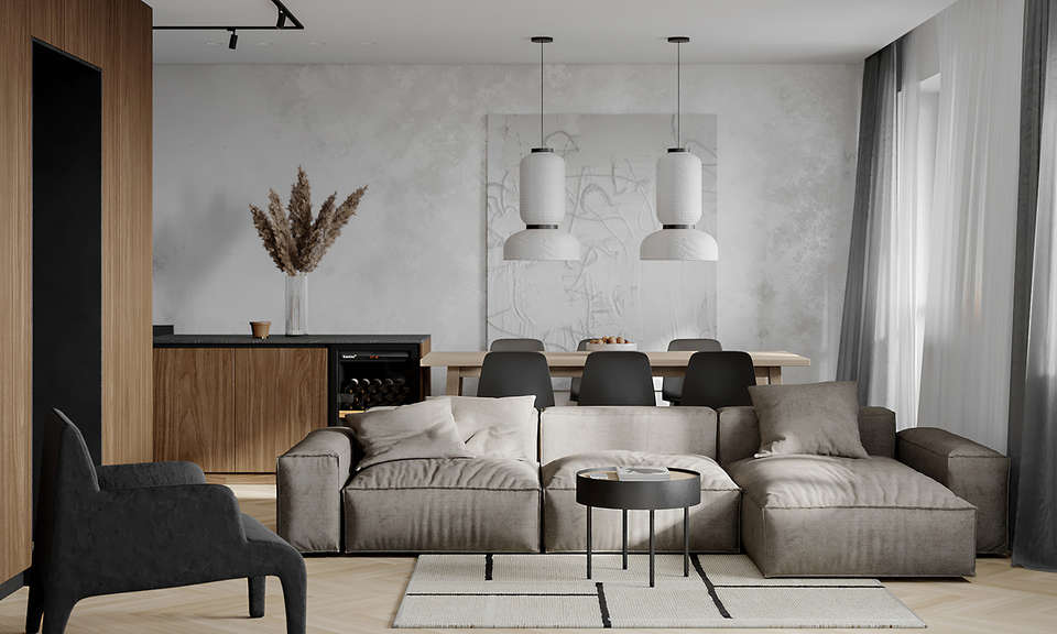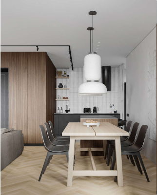 客廳、餐廳與廚房共處于一室,白色作為底色,原木色與高級灰作為主色調,三色搭配得當,目光所及于處高級舒適。