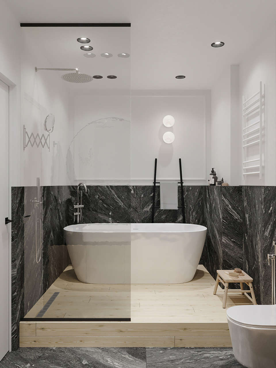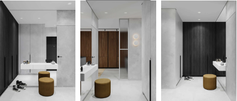 洗浴區(qū)域墊高鋪設木質的防水地板,泡澡后或是淋浴時赤腳踩在實木地板上,溫潤觸感瞬間讓洗澡的舒適感加倍。