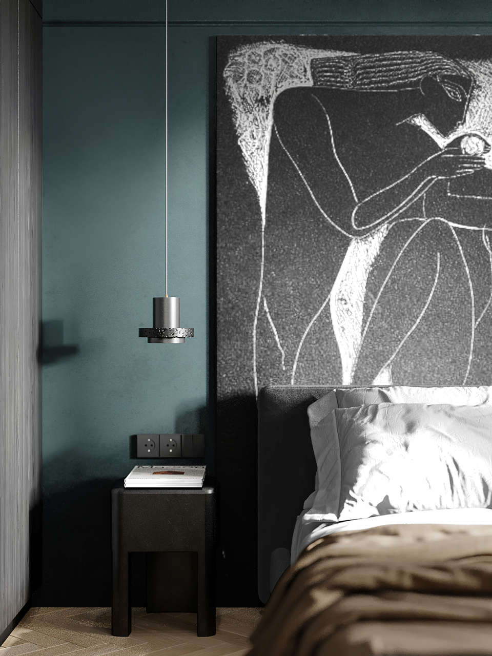 舒適的臥房柔軟的雙人床下鋪設上大面積的卡其色的棉麻地毯,柔軟舒適,床頭的壁畫是整個房間的亮點,床頭背景墻為與壁畫色彩區(qū)分看來使用相同灰度的墨綠色打底,整體看起來協(xié)調而具有層次感。