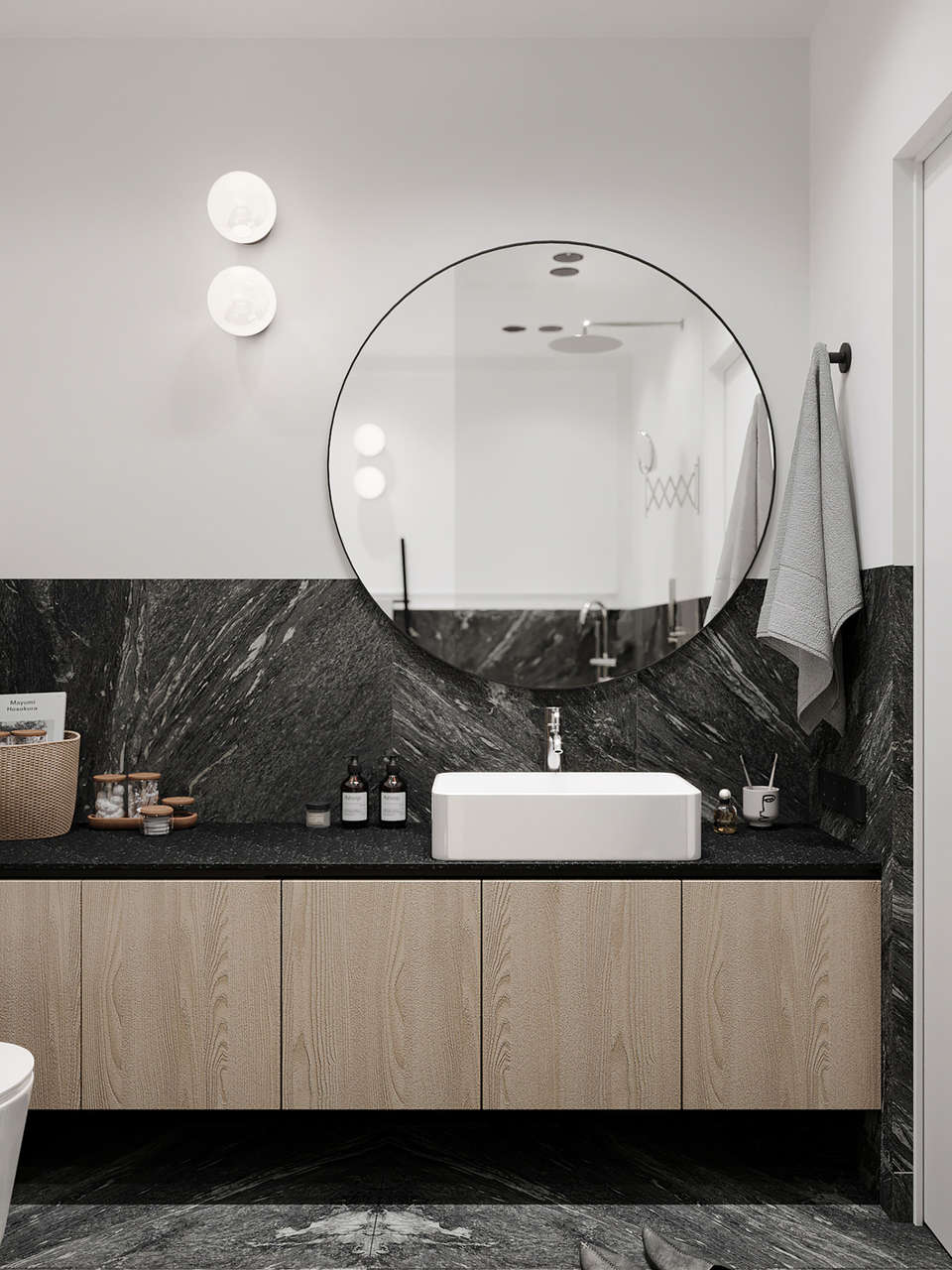 浴室的入門掛墻式收納柜,柜地與地板留出一定的空間,便于打掃也利于防潮,黑色大理石的臺面搭配白色的色臺上洗臉盆,黑與白搭配簡潔大方。