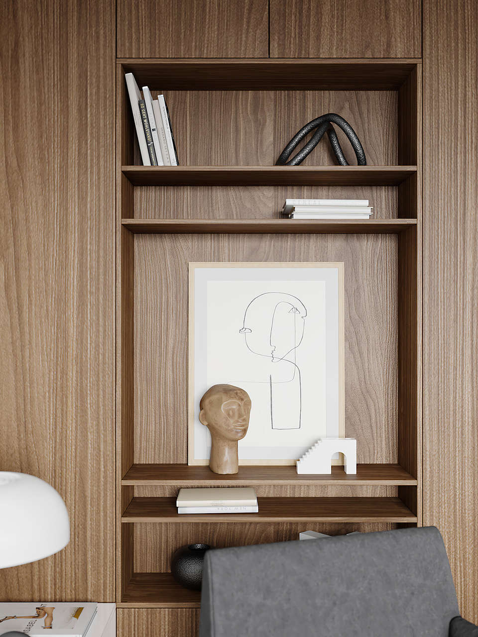 維持一個家整潔干凈的不是勤勞能干的女主人,而是有極大收納能力的收納柜,我們將客廳一側的墻面打造成隱形收納柜,柜門看起來以為只是墻飾,打開柜門里面卻另有一番天地。