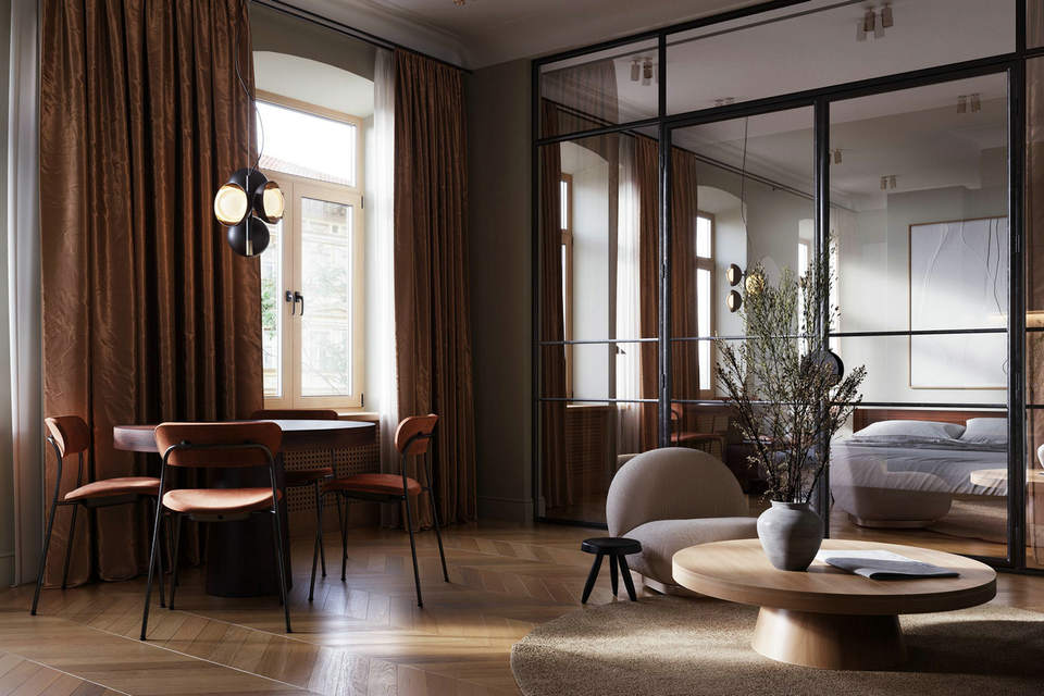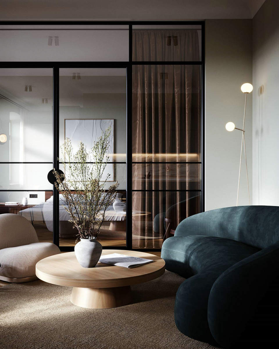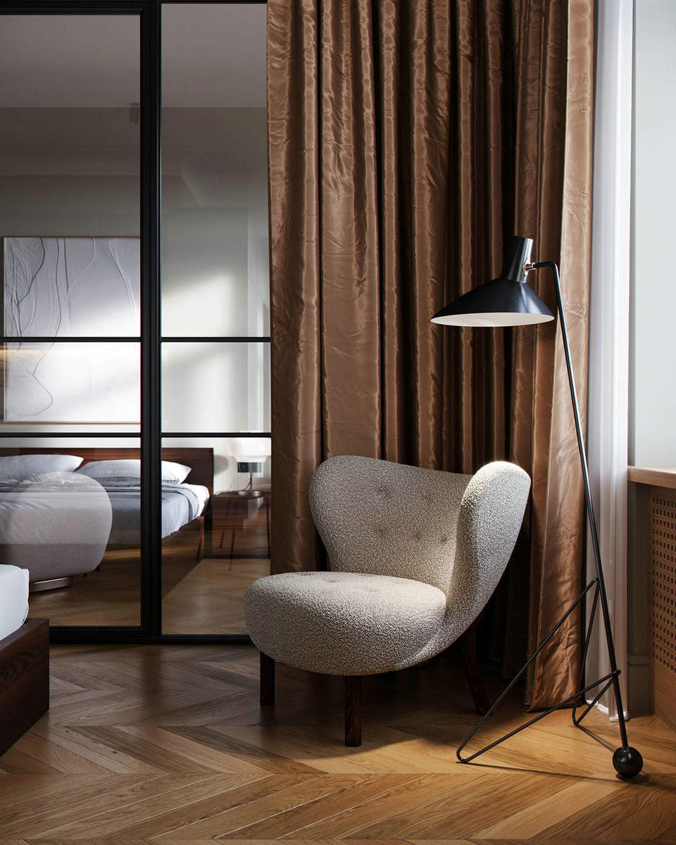 臥房與客廳之間以玻璃為墻與門,兩面采光讓臥室更加通透,淺棕色絲質(zhì)遮光窗簾擋住光線保護睡眠與隱私。