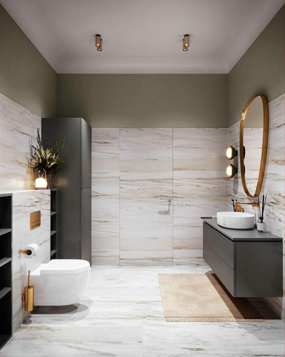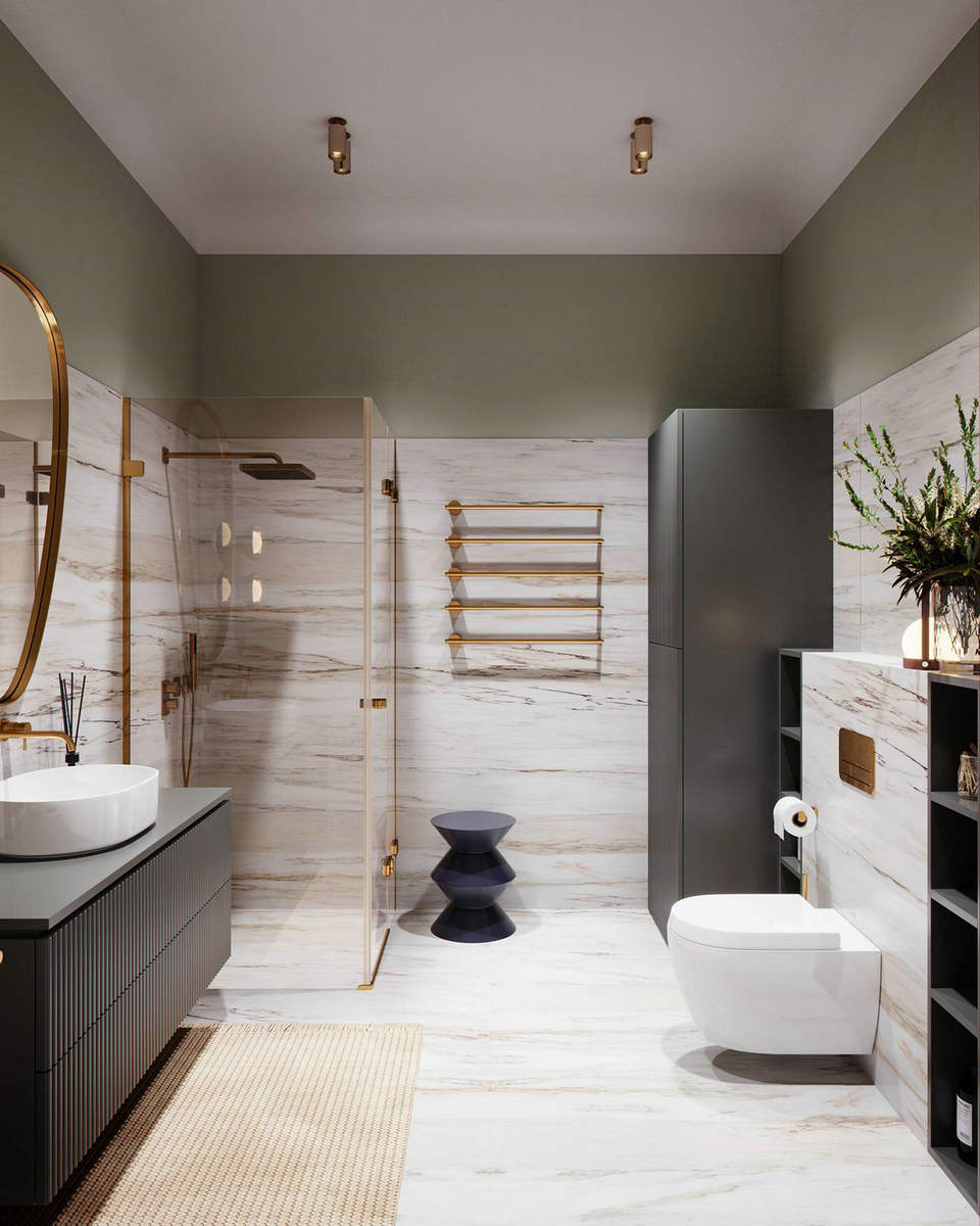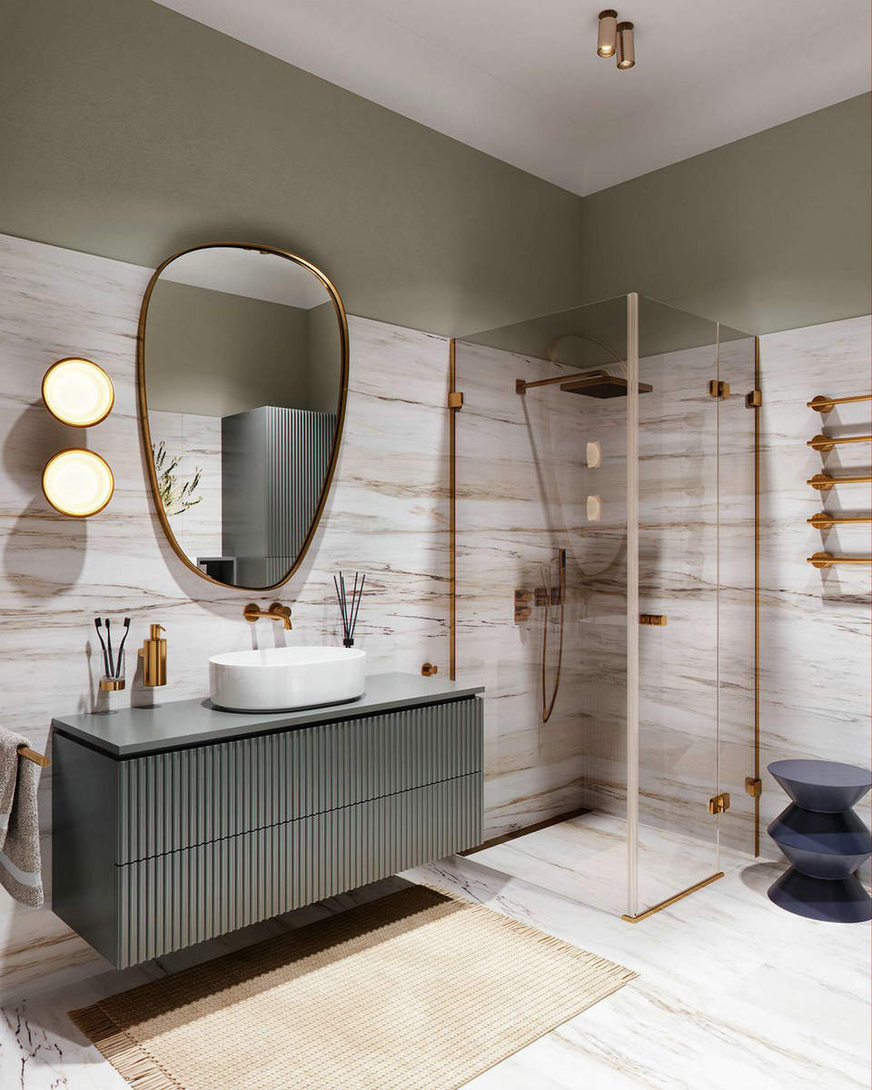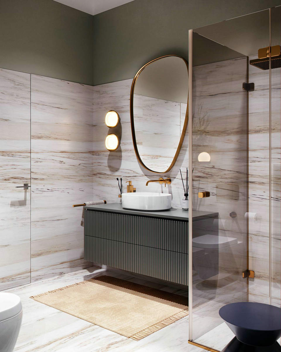 與灶臺相同紋理的大理石,搭配著淺綠色鋪貼在浴室的墻面地板上,弧形的浴室鏡與客廳弧線型的元素相呼應,金屬黃銅色在浴室大量的使用,以線條的方式呈現(xiàn),灼灼奢華,充滿質(zhì)感。