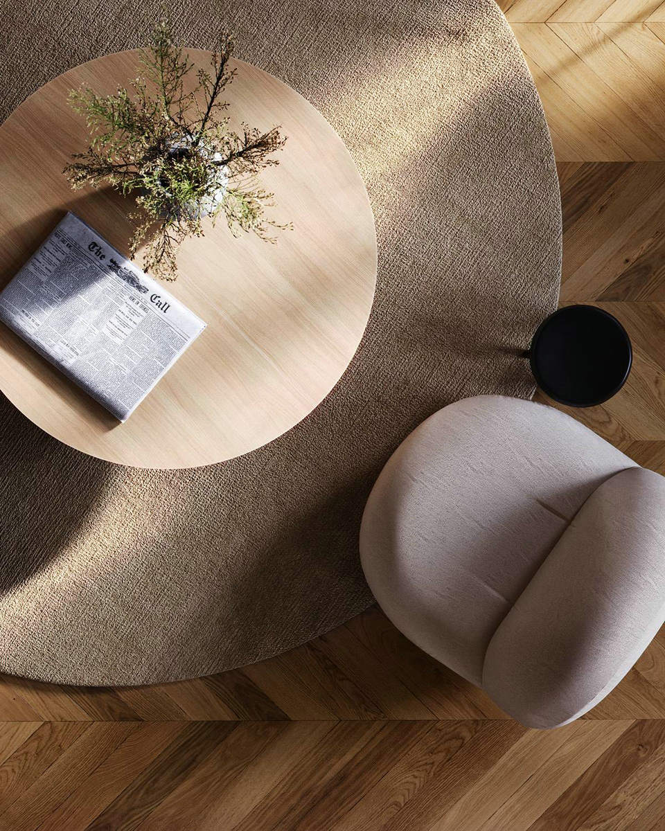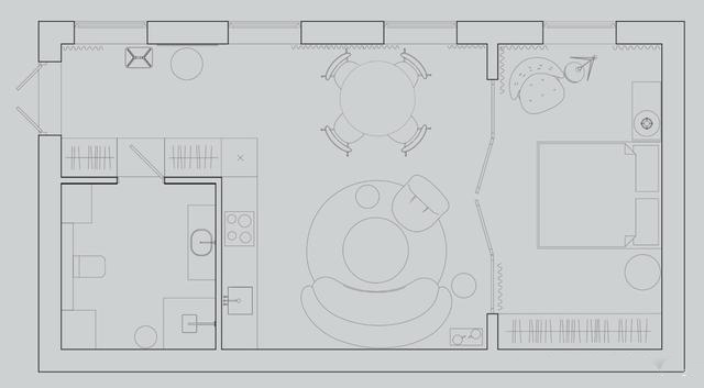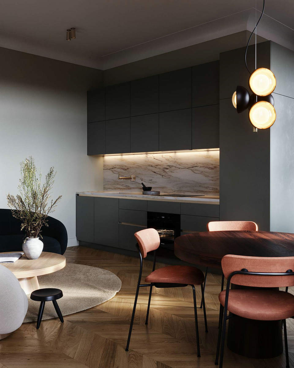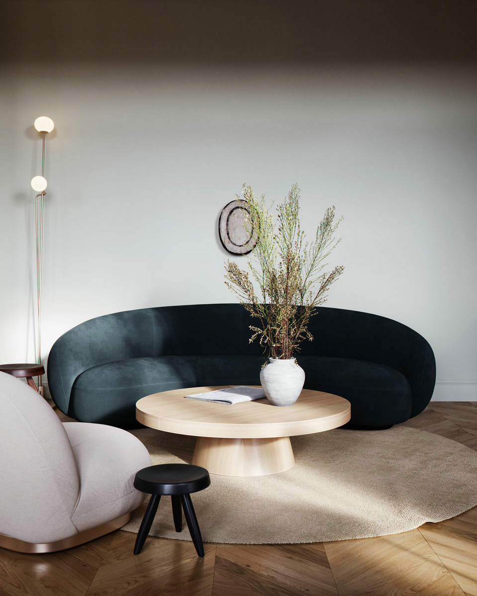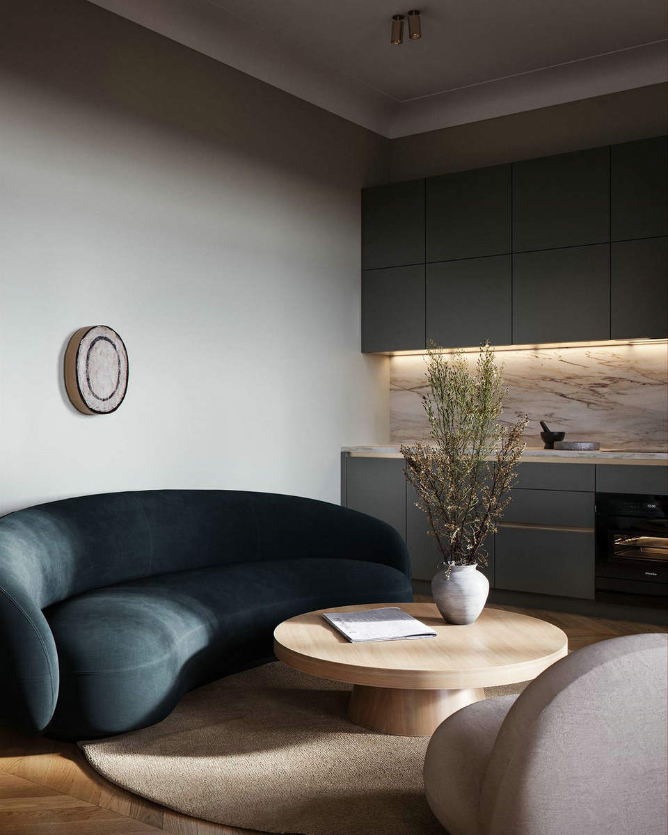 將客廳、廚房、餐廳置于同一空間,墨綠色的圓弧形沙發(fā),灰白色的單人座椅,木質(zhì)的圓形矮桌,淺黃色的棉麻地毯,優(yōu)雅而寧靜。