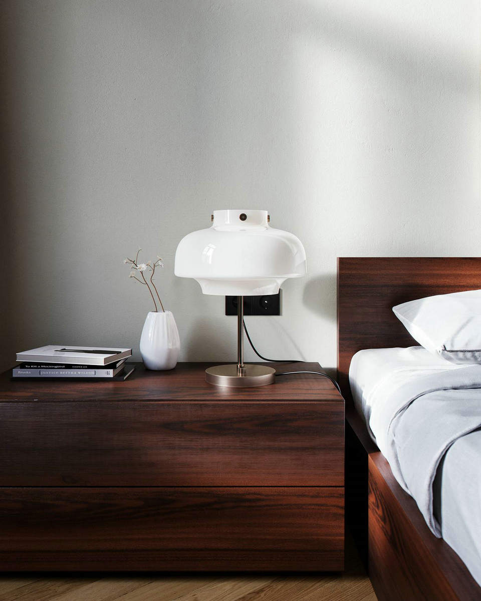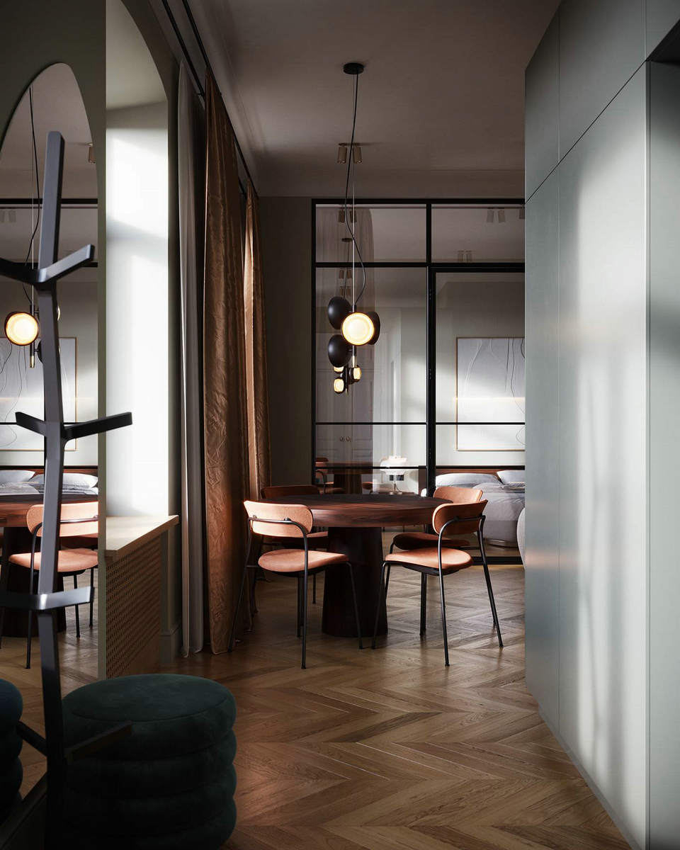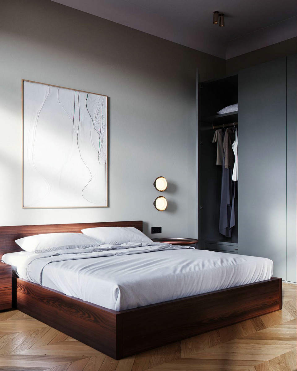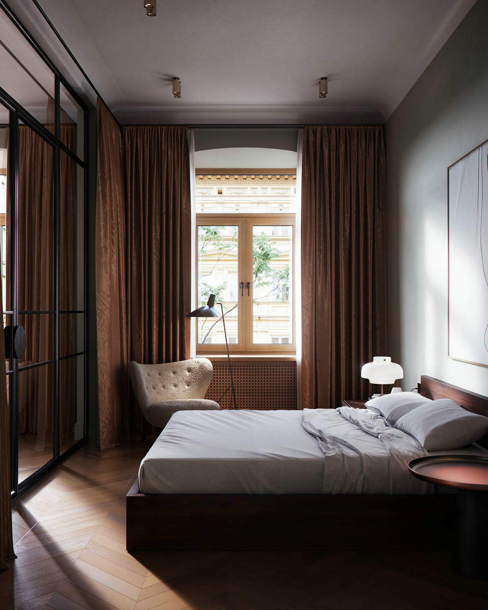 與客廳統(tǒng)一的魚骨拼地板與深色的胡桃木家具在淺綠色的映襯下顯得頗具質(zhì)感。黃銅色的圓桌、畫框、臺燈點綴讓臥室?guī)в袔追州p奢感。