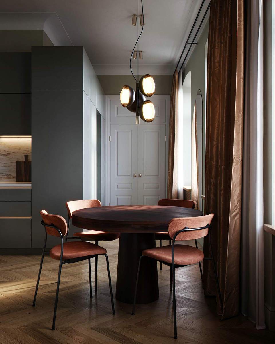 棕紅色的餐座椅臨窗而設,與墨綠色的圓弧形沙發(fā)形成色彩對比與沖擊,木質(zhì)厚重的圓桌,皮質(zhì)輕巧的餐椅,極具個性的鐵藝吊燈,讓空間充滿藝術性。