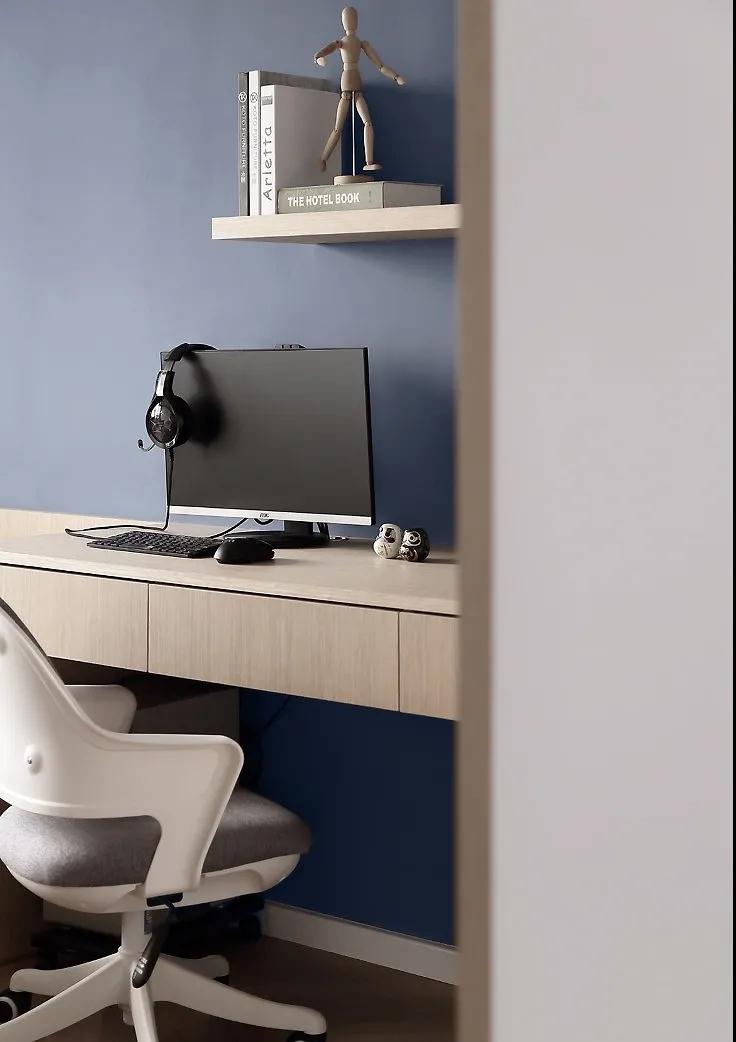 藍(lán)灰色墻面與客廳沙發(fā)背景墻色系相同,與原木色相襯干凈利落,作為書(shū)房和客臥,放上一張單人床,放置一個(gè)懸掛式書(shū)桌,整個(gè)空間寬敞明亮。