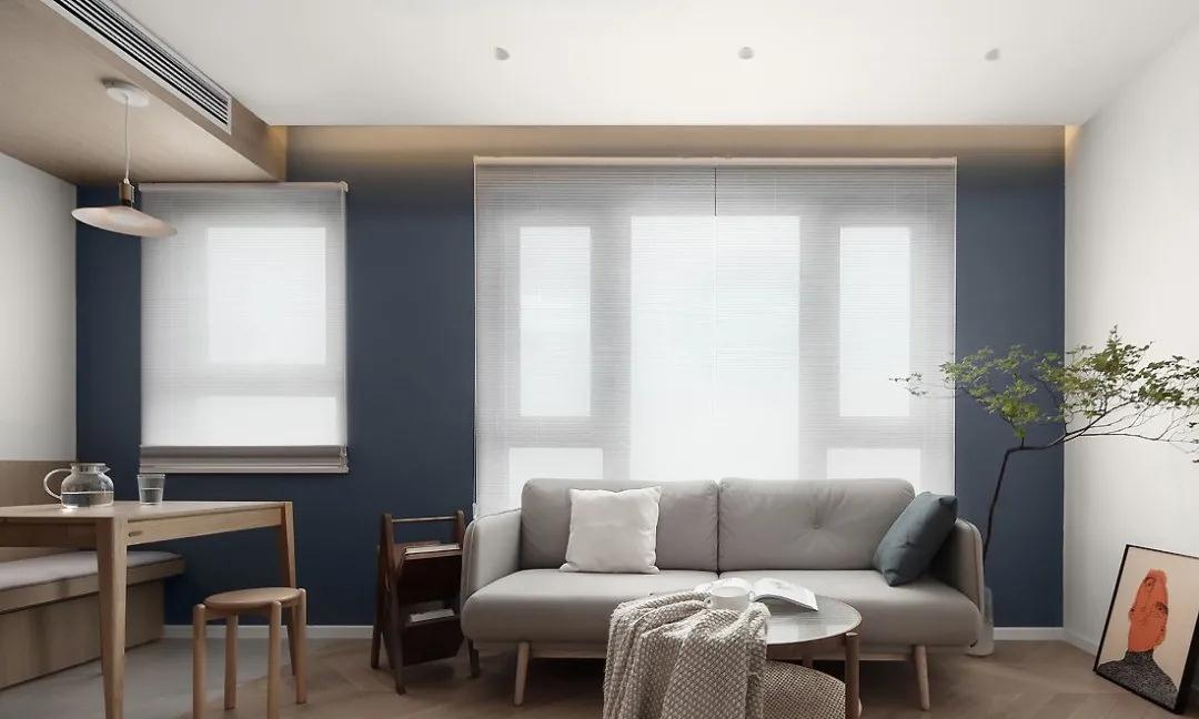 L型掛墻電視柜與白色乳膠漆墻面搭配簡(jiǎn)單而不失格調(diào),藍(lán)灰色沙發(fā)背景墻是空間色彩的點(diǎn)綴,搭配素凈的白色百葉窗簾,不需要過(guò)多的前面裝飾,便能給人輕盈而靈動(dòng)的質(zhì)感。