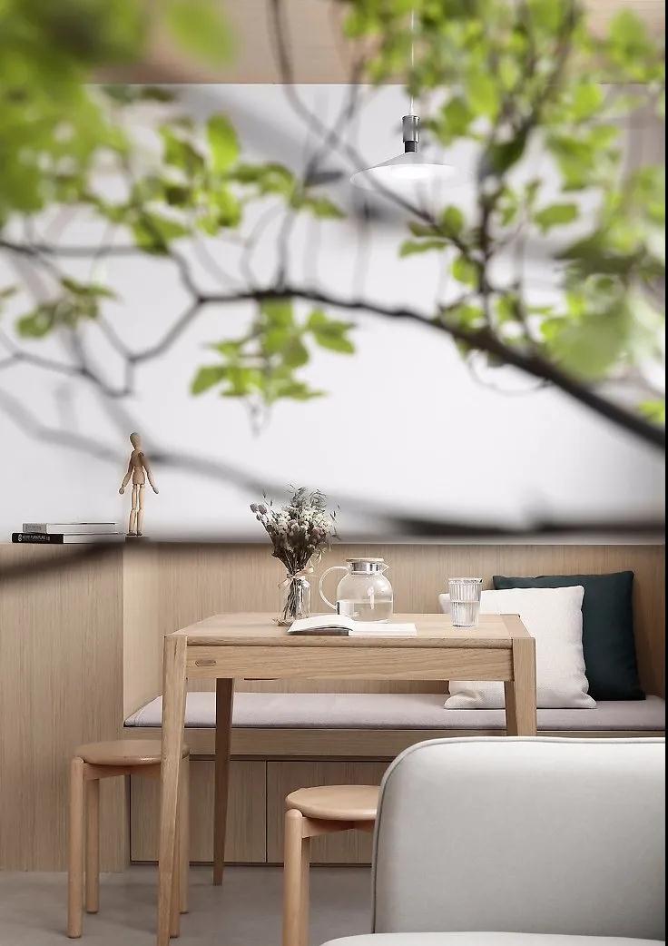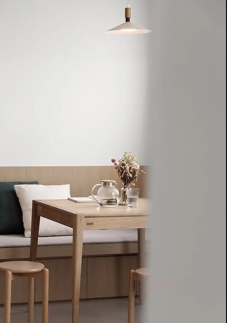 餐廳卡座做成開(kāi)門(mén)式收納柜,鋪上軟墊與抱枕,提高坐感的舒適度,搭配簡(jiǎn)單的原木色系木質(zhì)餐桌,打造溫馨質(zhì)樸的就餐環(huán)境。