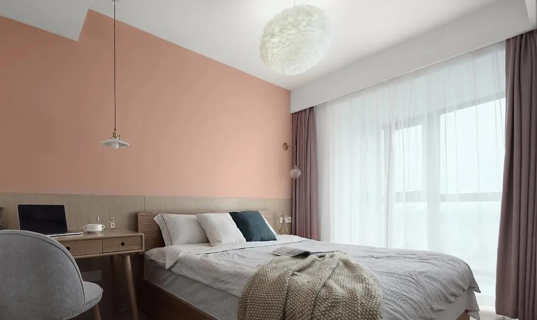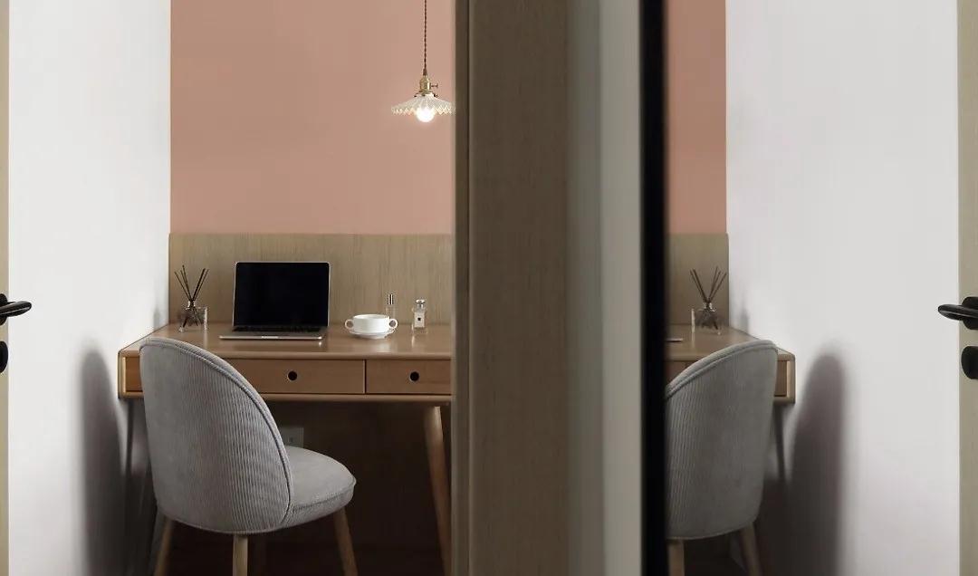 粉橘色的墻面配以金屬壁燈,高腳書(shū)桌搭配復(fù)古吊燈讓整個(gè)空間變得輕盈且溫柔,臟粉色窗簾與原木色相撞,多了幾分溫馨又讓人心動(dòng)的復(fù)古感。