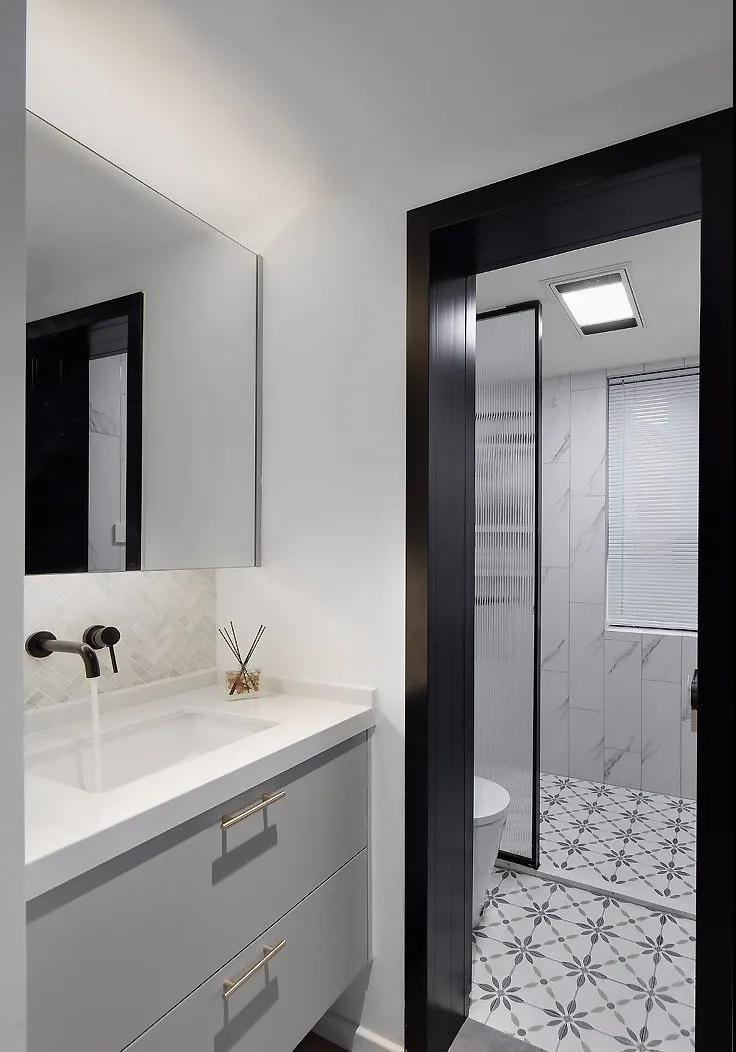 衛(wèi)生間做了干濕分離,淋浴區(qū)用擋水條與一塊長(zhǎng)虹玻璃作為隔斷,整個(gè)空間白色為主配以黑色的線條框線,不會(huì)過(guò)時(shí)的搭配,簡(jiǎn)單而充滿高級(jí)感。