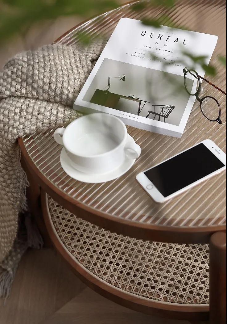 簡(jiǎn)約的雙層圓形茶幾,上層以帶有紋理的半透明玻璃作為臺(tái)面,下層以藤編作為置物層,給人復(fù)古自然的的視覺(jué)感。