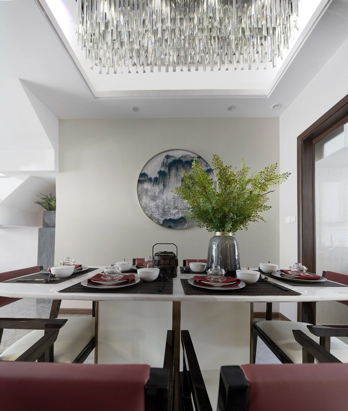 設(shè)計(jì)師沒有刻意去打造一種中式風(fēng)氛圍,而是注重意境的營造。所以你會(huì)看到設(shè)計(jì)師用粉紅色去裝飾次臥,用紅色與藍(lán)色去裝飾客廳。但是一些別出心裁的裝飾畫,卻將新中式的特色體現(xiàn)得一覽無遺。
