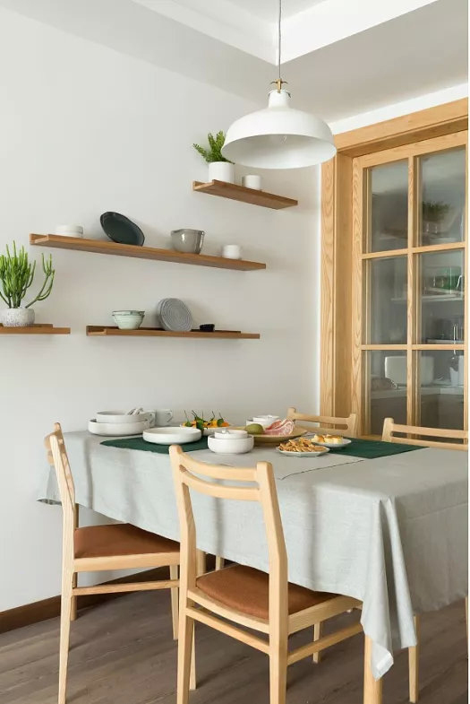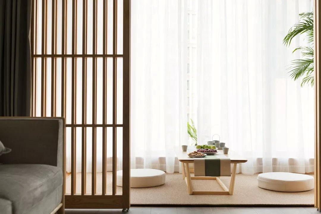設(shè)計(jì)師大量采用木質(zhì)的家具,去打造一個(gè)自然典雅的空間??蛷d旁邊的陽臺(tái)被改成了日式的榻榻米,既能休閑,也能會(huì)客。