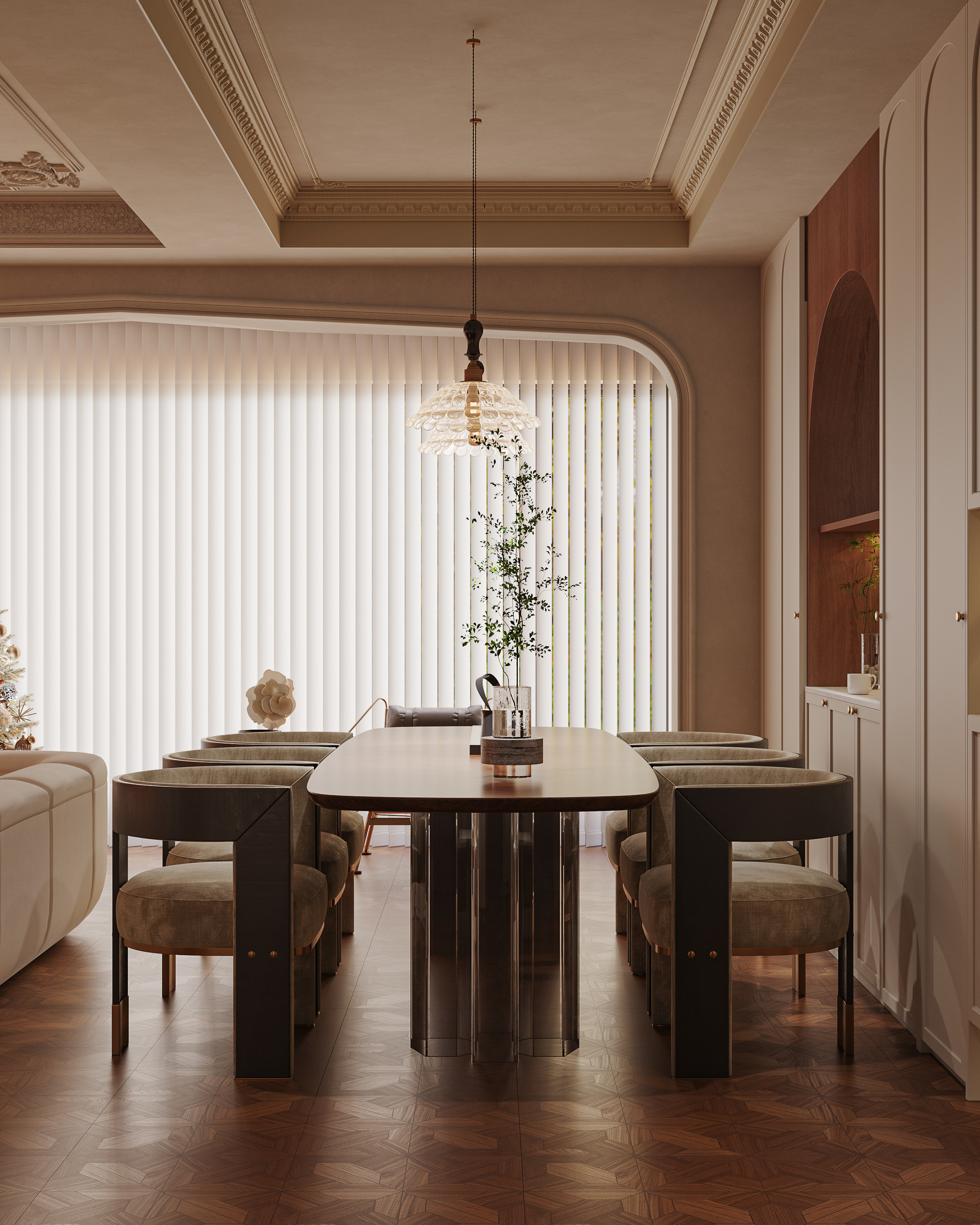 桌椅旁的金屬線條增添了餐廳的質(zhì)感,又在餐桌上擺放綠植點綴,通過大窗戶將室外的自然景色引入室內(nèi),綠意與室內(nèi)環(huán)境的完美融合,為餐廳增添了一份寧靜與生機(jī)。