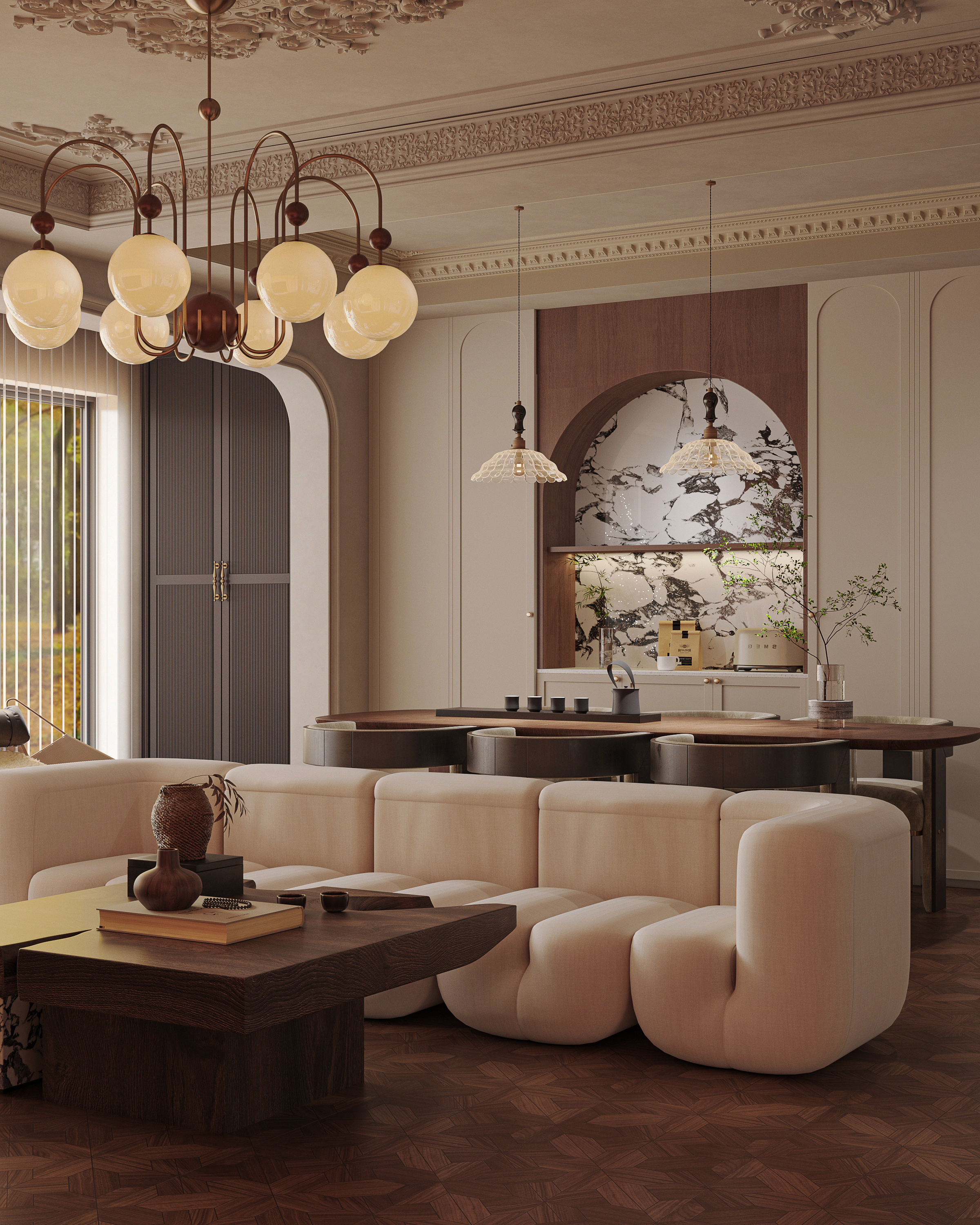 客廳與陽臺用拱形門相連,線條柔美而優(yōu)雅,讓室外的光線與景致自然過渡至室內(nèi),營造出一種溫馨而浪漫的氛圍。