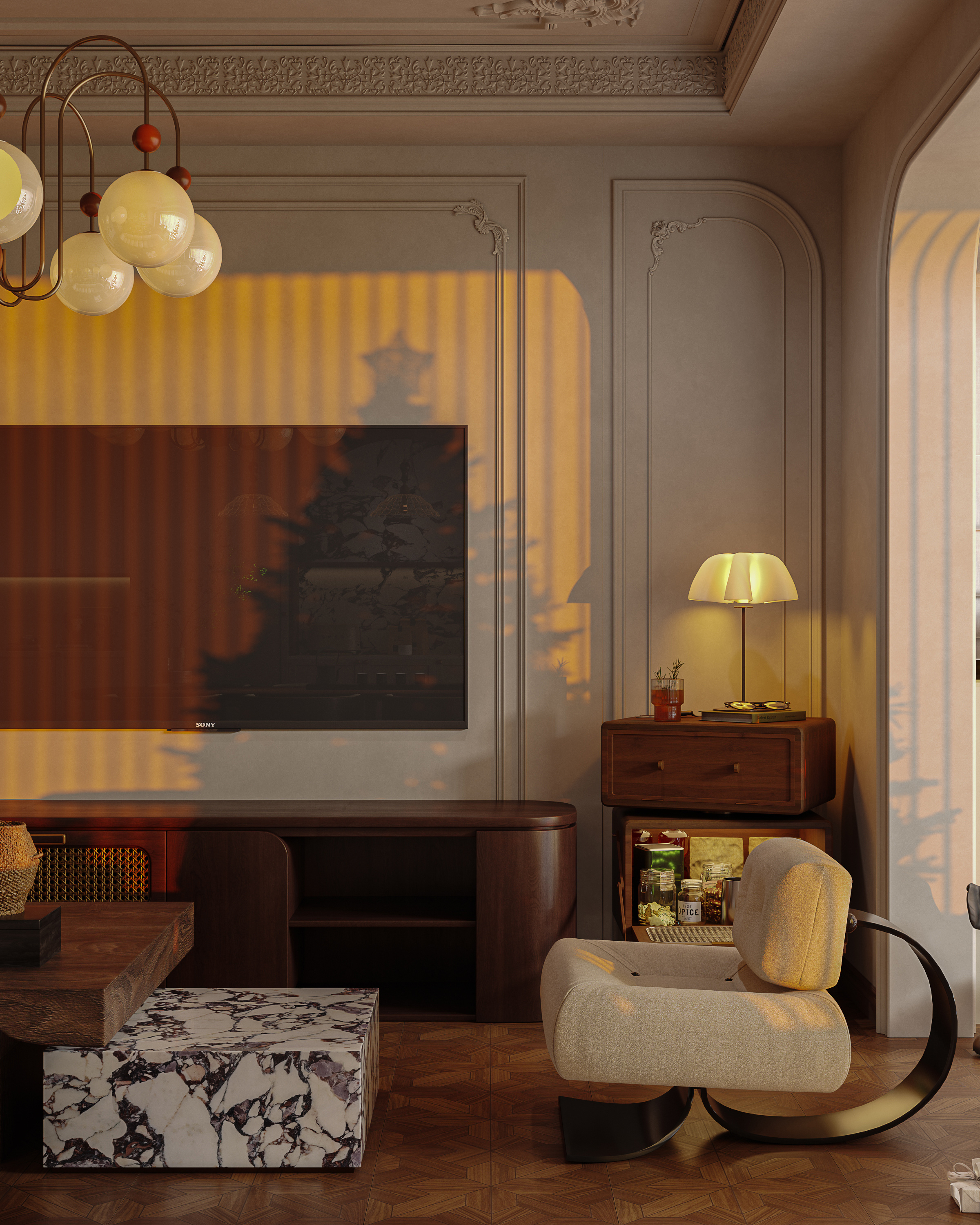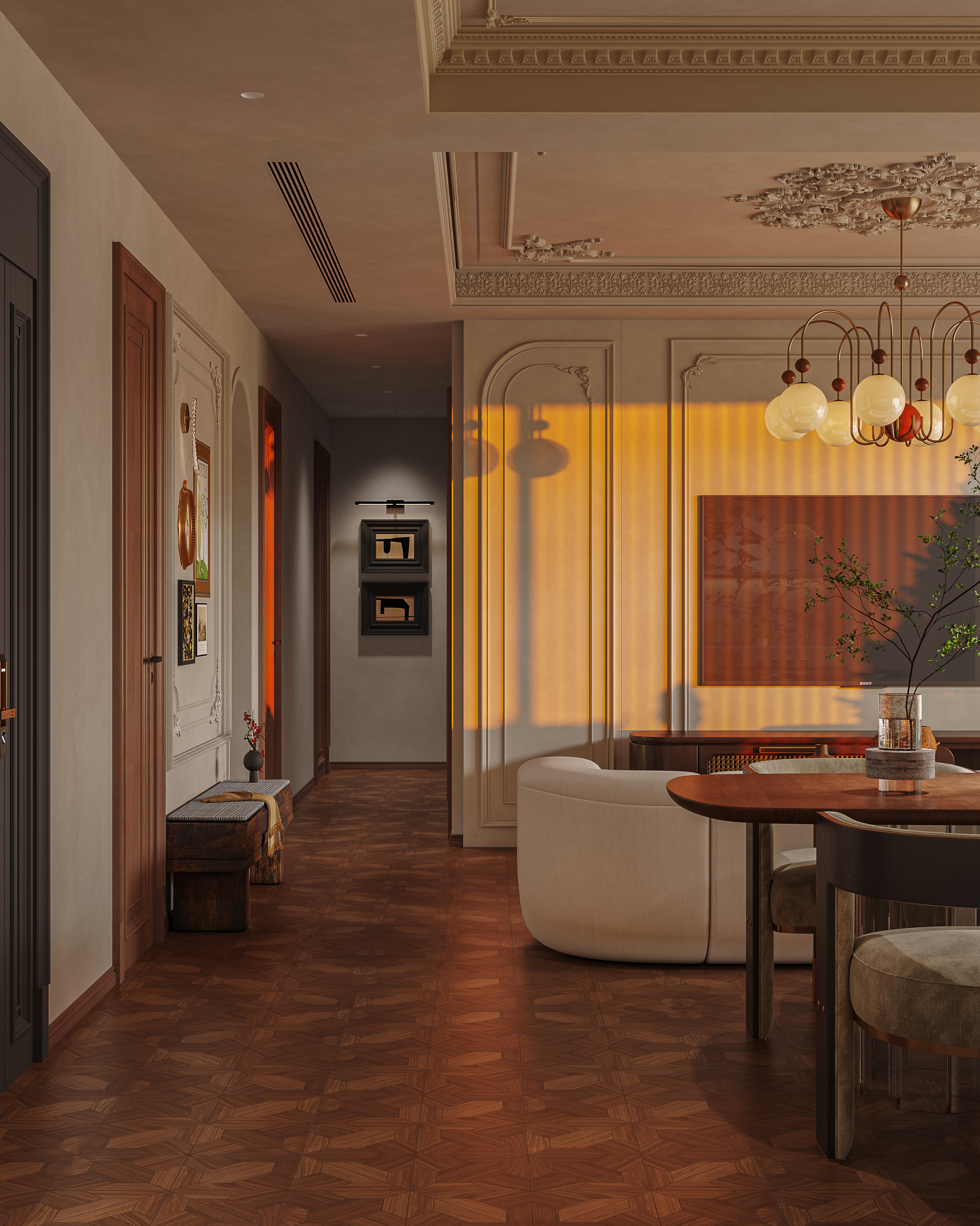 整個空間以米色和棕色為主色調(diào),米色作為主墻色和家具的基色,棕色則通過木質(zhì)家具、地板以及裝飾品中的點綴,這兩種顏色相互交織,整體設(shè)計更加飽滿且富有層次感。