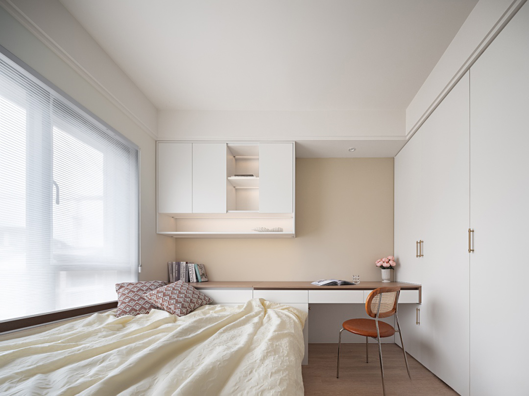 白色與米色的主色調(diào)奠定了空間的基調(diào)。大窗戶的設(shè)計(jì)不僅確保了室內(nèi)充足的自然光線,還使得空間更加明亮通透。床尾巧妙地設(shè)置了一個(gè)與之相連的書(shū)桌區(qū)域,使得整個(gè)空間得到了高效的利用。