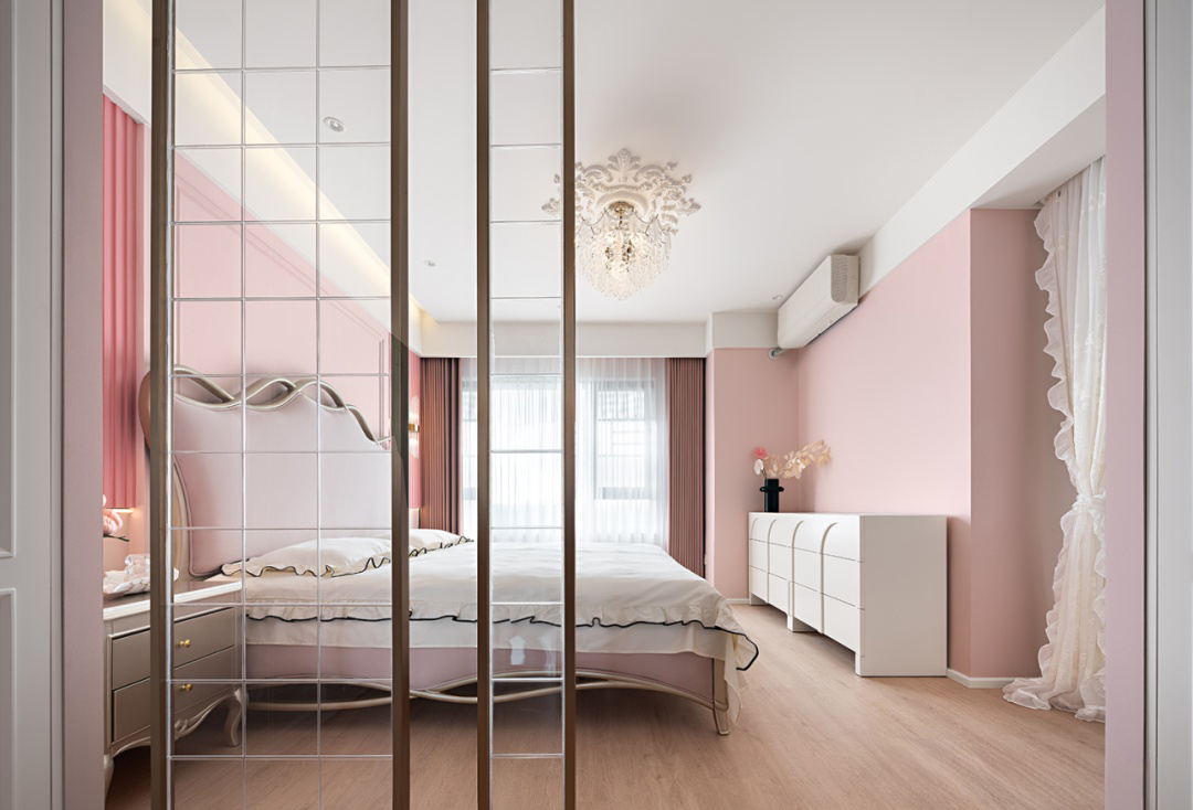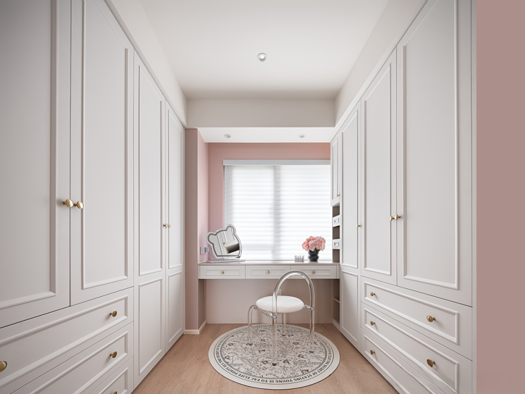 整體色調(diào)以粉色與白色為主,粉色作為主色調(diào),為空間披上了一層溫柔的面紗,白色作為輔助色,墻面、天花板、衣柜以及梳妝臺(tái)等家具,與粉色的床品、窗簾等軟裝相互映襯,使得整個(gè)主臥看起來(lái)既簡(jiǎn)潔又不失層次感。