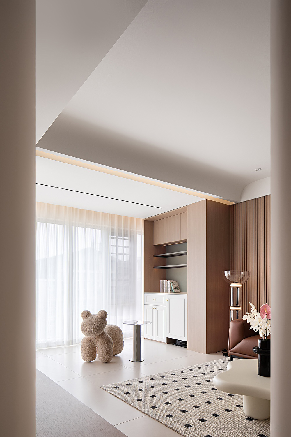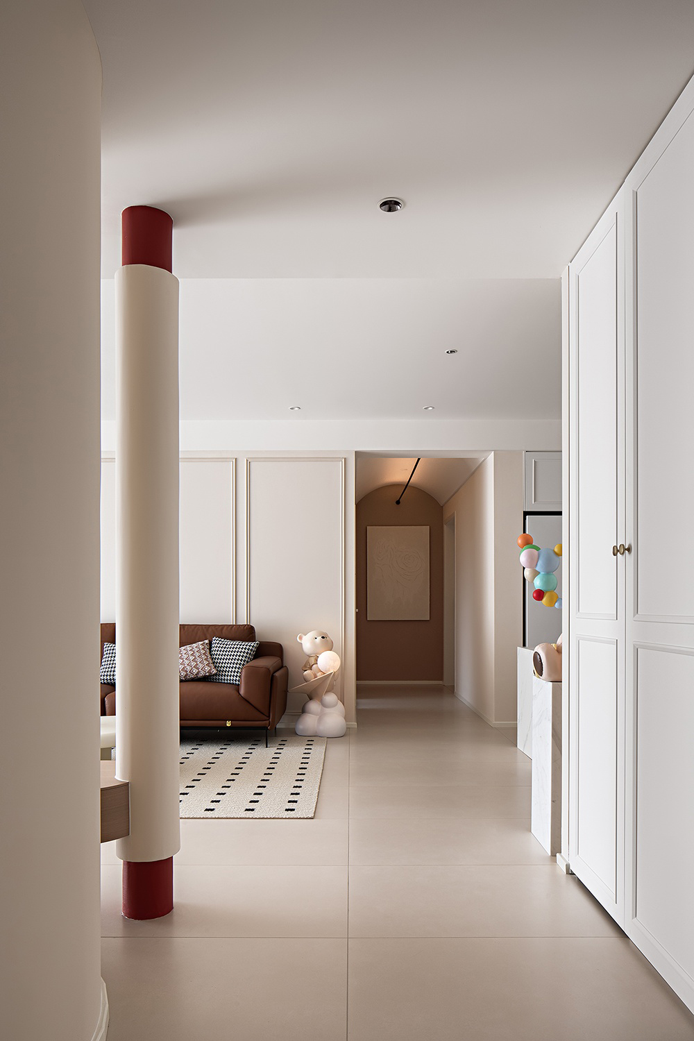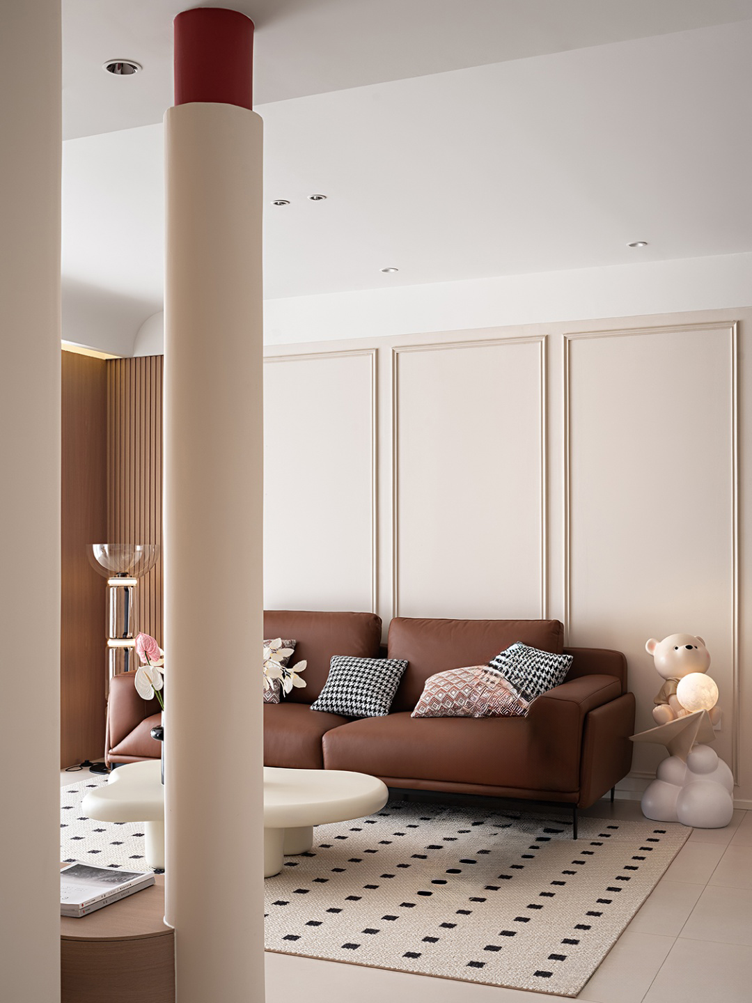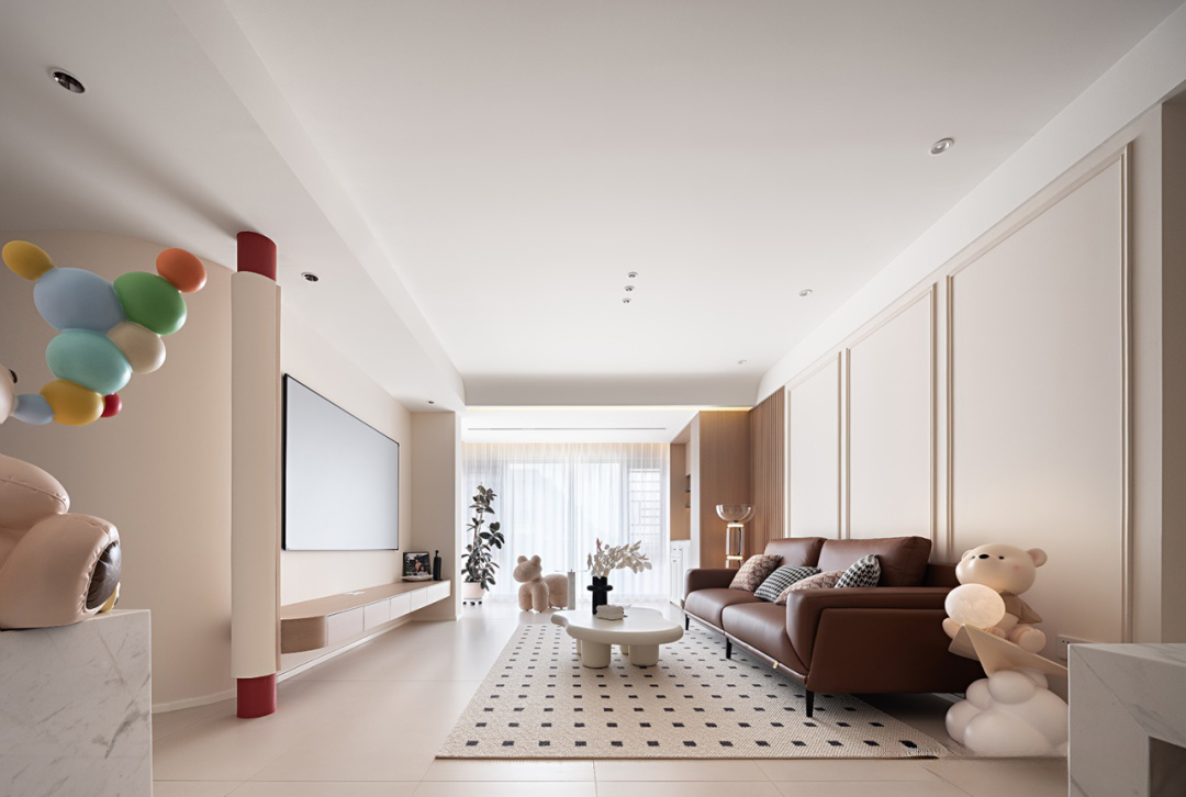棕色沙發(fā)搭配白色茶幾,色彩和諧,營(yíng)造溫馨氛圍。淺色墻壁與白色地板相映成趣,空間明亮通透。嵌入式燈具點(diǎn)綴天花板,增添光影美感。大理石臺(tái)面裝飾獨(dú)特,粉色氣球與小熊玩偶增添一抹童真與文藝氣息,整體裝修簡(jiǎn)約中透露著不凡品味。