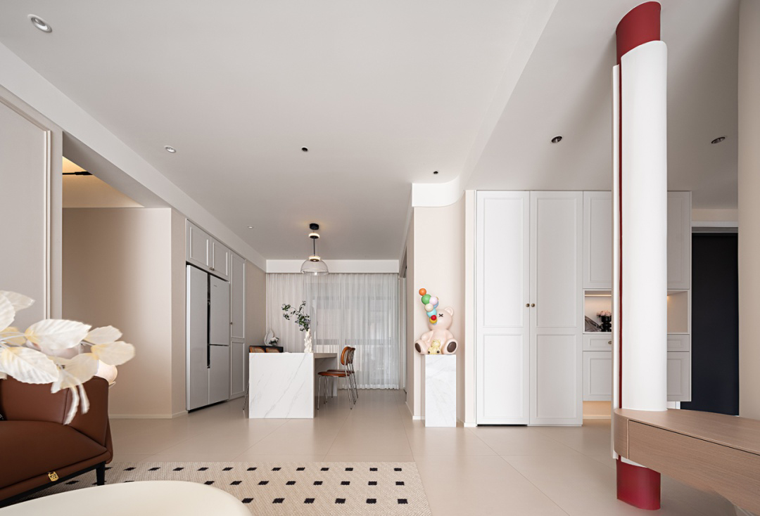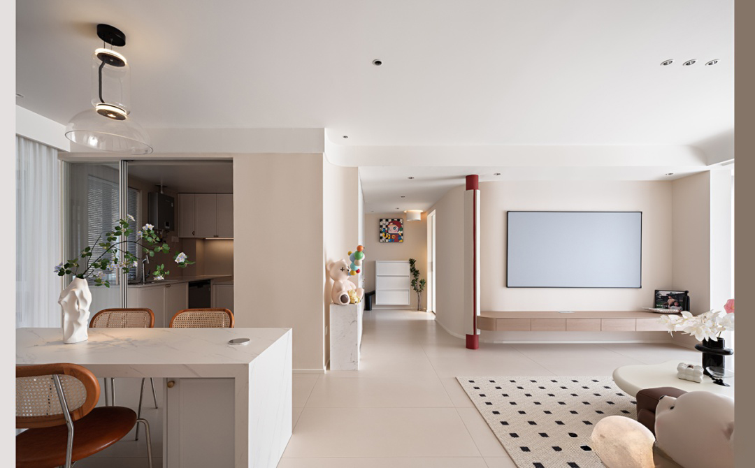 客餐一體,以白色為主色調(diào),營(yíng)造出明亮寬敞的空間感。大理石材質(zhì)餐桌設(shè)計(jì)簡(jiǎn)潔實(shí)用,搭配木質(zhì)與金屬材質(zhì)的椅子,展現(xiàn)材質(zhì)對(duì)比美,桌上精致的花瓶,營(yíng)造出濃厚的文藝氛圍,整體設(shè)計(jì)既符合現(xiàn)代審美,又不失溫馨舒適的用餐體驗(yàn)。