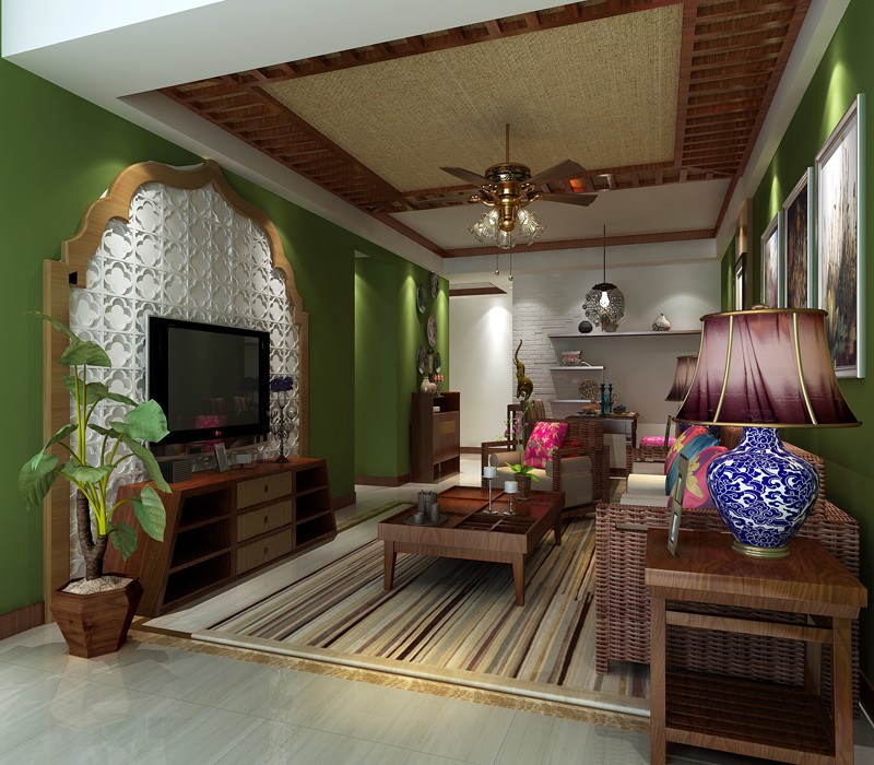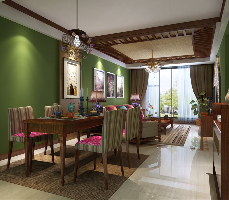 餐廳和客廳那一面綠色的背景墻十分個(gè)性,抓人眼球,整體上很符合我們中國(guó)人的生活習(xí)慣,但是也多了很多東南亞的風(fēng)情。