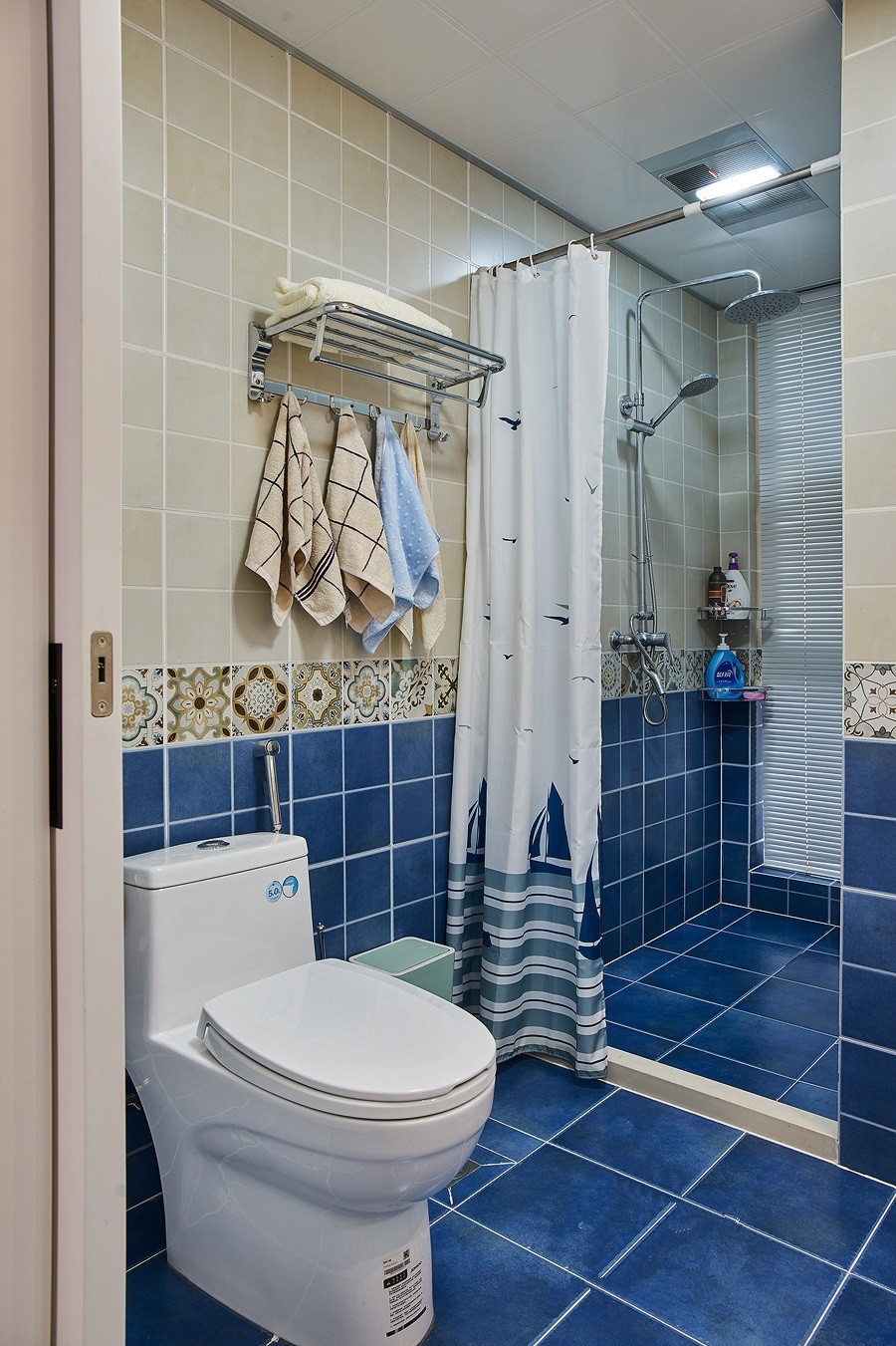這套為三口之家準(zhǔn)備的美式風(fēng)格,風(fēng)格清新,溫馨舒適,衛(wèi)生間把藍(lán)色作為主色調(diào),有一種航海出行的童心。