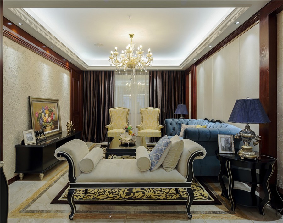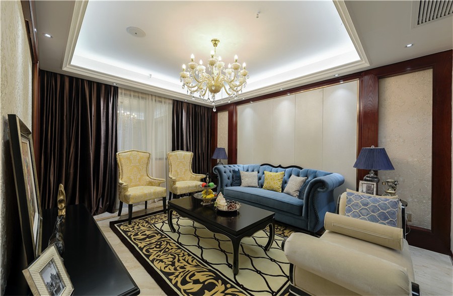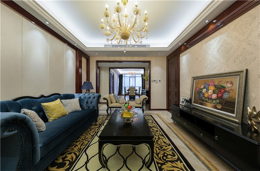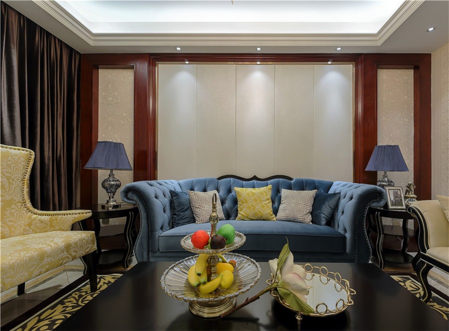 客廳里藍色的天鵝絨沙發(fā)很有質(zhì)感,整個空間給人一種成熟穩(wěn)重的感覺。
