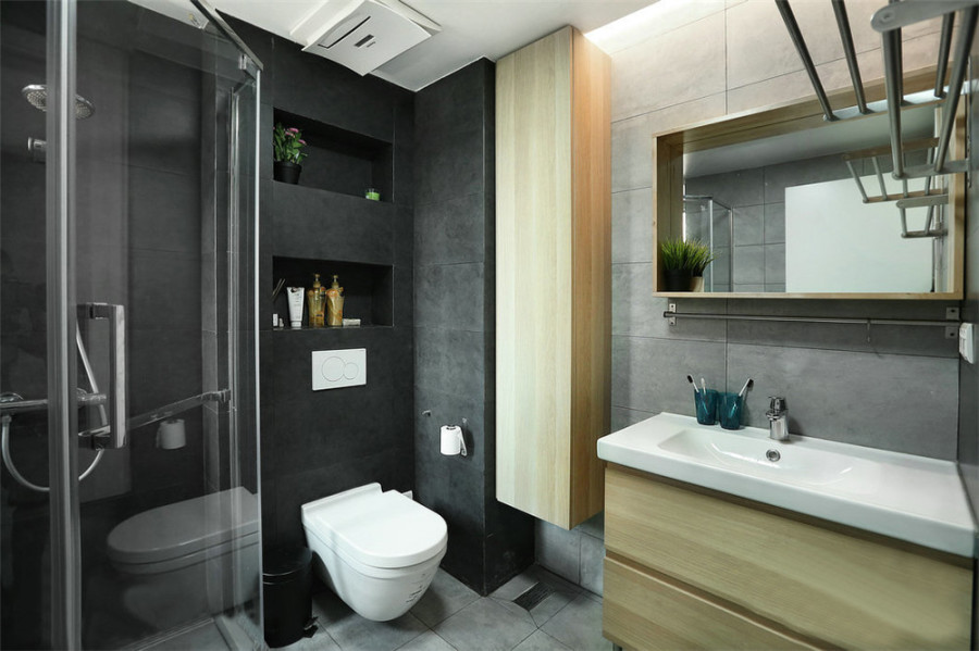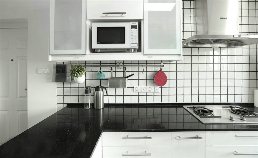 廚房用了黑線白格子的瓷磚,白色讓整個(gè)廚房看起來更明亮,黑線條可以增加層次感。格子也是北歐風(fēng)常見元素之一。