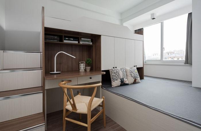深色的背景墻和淺色的家具搭配在一起,增添空間的層次感。次臥用定制的組合柜做成榻榻米的樣式,節(jié)省了占地面積,增加了儲物空間。