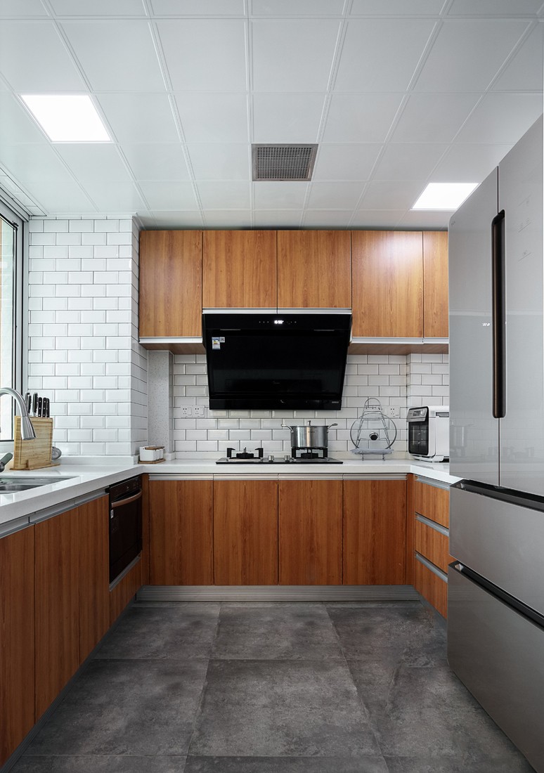 設(shè)計(jì)師重點(diǎn)在于打造一種中式風(fēng)格寧?kù)o致遠(yuǎn)的禪意,所以用淺灰色的布藝沙發(fā)和木質(zhì)家具搭配在一起,有一種和諧的美感。