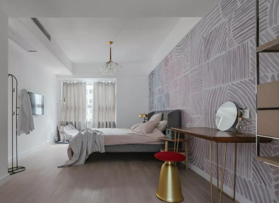 為了讓臥室看起來不會太單調(diào),設(shè)計師用藍粉色設(shè)計了一面獨特的背景墻,非常抓人眼球。
